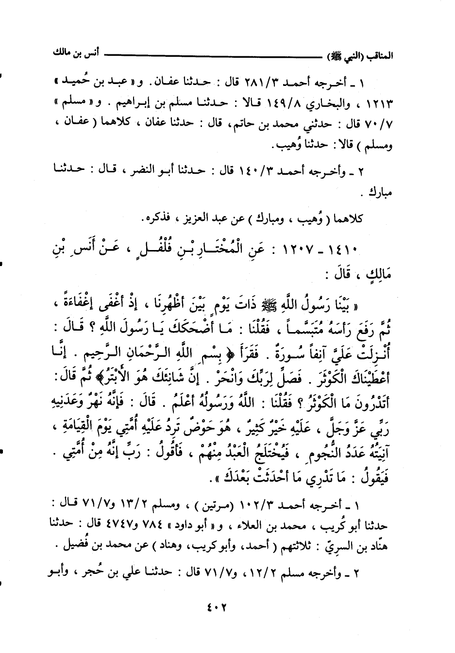 بَيْنَا رَسُولُ اللهِ صلى الله عليه وسلم ذَاتَ يَوْمٍ بَيْنَ أَظْهُرِنَا، إِذْ أَغْفَى إِغْفَاءَهً، ثُمَّ رَفَعَ رَأْسَهُ مُتَبَسِّمًا، فَقُلْنَا: مَا أَضْحَكَكَ يَا رَسُولَ اللهِ؟ قَالَ: أُنْزِلَتْ عَلَيَّ آنِفًا سُورَةٌ، فَقَرَأَ: بِسْمِ اللهِ الرَّحْمَانِ الرَّحِيمِ. إِنَّا أَعْطَيْنَاكَ الْكَوْثَرَ. فَصَلِّ لِرَبِّكَ وَانْحَرْ. إِنَّ شَانِئَكَ هُوَ الأَبْتَرُ)، ثُمَّ قَالَ: أَتَدْرُونَ مَا الْكَوْثَرُ؟ فَقُلْنَا: اللَّهُ وَرَسُولُهُ أَعْلَمُ، قَالَ: فَإِنَّهُ نَهَْرٌ وَعَدَنِيهِ رَبِّي، عَزَّ وَجَلَّ، عَلَيْهِ خَيْرٌ كَثِيرٌ، هُوَ حَوْضٌ تَرِدُ عَلَيْهِ أُمَّتِي يَوْمَ الْقِيَامَةِ، آنِيَتُهُ عَدَدُ النُّجُومِ، فَيُخْتَلَجُ الْعَبْدُ مِنْهُمْ، فَأَقُولُ: رَبِّ، إِنَّهُ مِنْ أُمَّتِي، فَيَقُولُ: مَا تَدْرِي مَا أَحْدَثَتْ بَعْدَكَ.