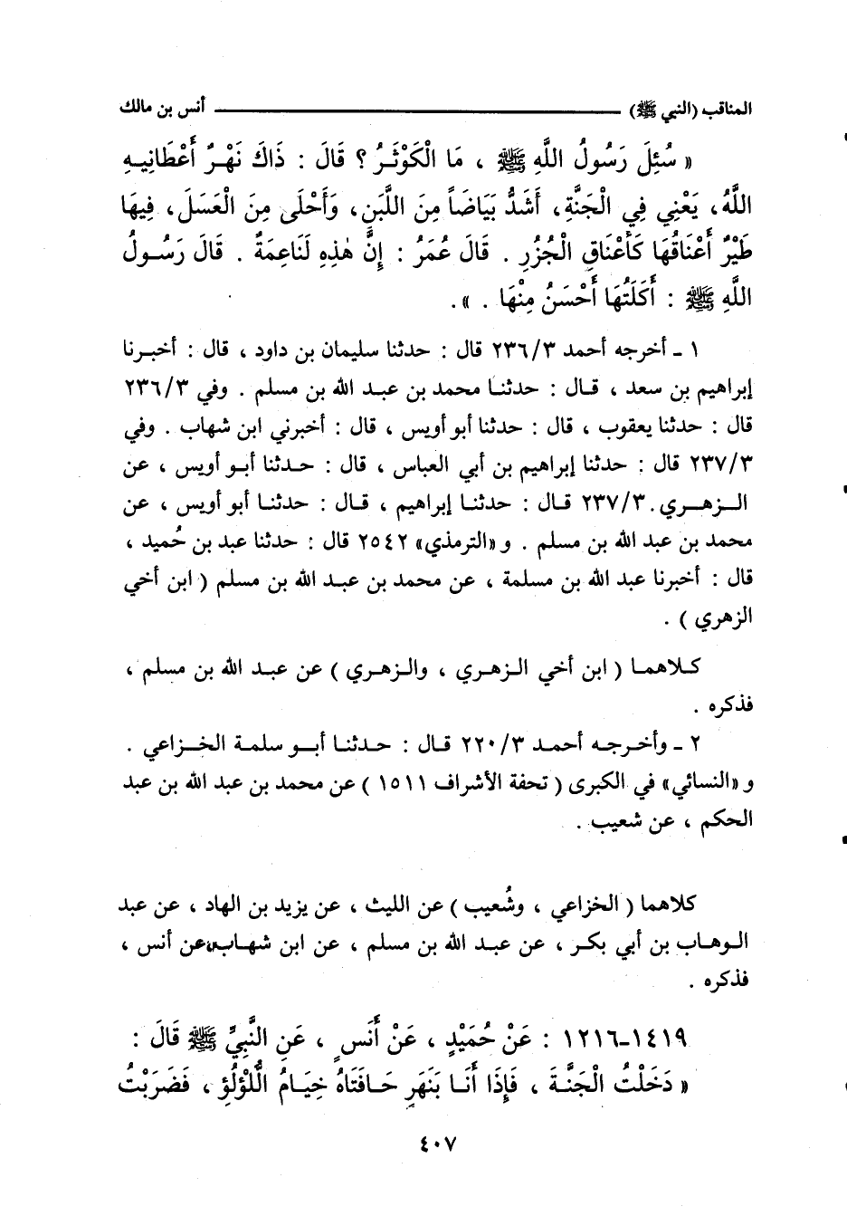 (سُئِلَ رَسُولُ اللهِ صلى الله عليه وسلم عَنِ الْكَوْثَرِ؟ فَقَالَ: هُوَ نَهَْرٌ أَعْطَانِيهِ اللَّهُ، عَزَّ وَجَلَّ، فِي الْجَنَّةِ، تُرَابُهُ مِسْكٌ، مَاؤُهُ أَبْيَضُ مِنَ اللَّبَنِ، وَأَحْلَى مِنَ الْعَسَلِ، تَرِدُهُ طَيْرٌ أَعْنَاقُهَا مِثْلُ أَعْنَاقِ الْجُزُرِ، قَالَ: قَالَ أَبُو بَكْرٍ: يَا رَسُولَ اللهِ، إِنَّهَا لَنَاعِمَةٌ، فَقَالَ: أَكَلَتُهَا أَنْعَمُ مِنْهَا.