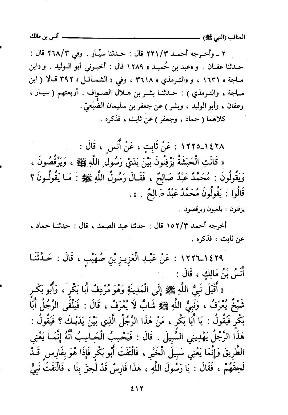 - لفظ هُدبة: أَنَّ الْحَبَشَةُ كَانُوا يَزْفِنُونَ بَيْنَ يَدَيْ رَسُولِ اللهِ صلى الله عليه وسلم، وَيَتَكَلَّمُونَ بِكَلَامٍ لَا يَفْهَمُهُ، فَقَالَ رَسُولُ اللهِ صلى الله عليه وسلم: مَا يَقُولُونَ؟ قَالُوا: يَقُولُونَ: مُحَمَّدٌ عَبْدٌ صَالِحٌ.