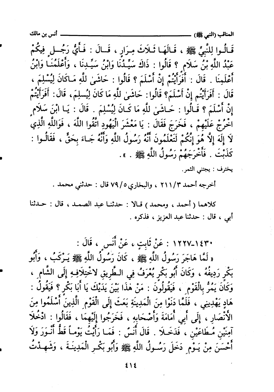 لَمَّا هَاجَرَ رَسُولُ اللهِ صلى الله عليه وسلم، كَانَ رَسُولُ اللهِ صلى الله عليه وسلم يَرْكَبُ، وَأَبُو بَكْرٍ رَدِيفُهُ، وَكَانَ أَبُو بَكْرٍ يُعْرَفُ فِي الطَّرِيقِ، لاِخْتِلَافِهِ إِلَى الشَّامِ، وَكَانَ يَمُرُّ بِالْقَوْمِ، فَيَقُولُونَ: مَنْ هَذَا بَيْنَ يَدَيْكَ يَا أَبَا بَكْرٍ؟ فَيَقُولُ: هَادٍ يَهْدِينِي، فَلَمَّا دَنَوْا مِنَ الْمَدِينَةِ، بَعَثَ إِلَى الْقَوْمِ الَّذِينَ أَسْلَمُوا مِنَ الأَنْصَارِ، إِلَى أَبِي أُمَامَةَ وَأَصْحَابِهِ، فَخَرَجُوا إِلَيْهِمَا، فَقَالُوا: ادْخُلَا آمِنَيْنِ مُطَاعَيْنِ، فَدَخَلَا. قَالَ أَنَسٌ: فَمَا رَأَيْتُ يَوْمًا قَطُّ أَنْوَرَ وَلَا أَحْسَنَ، مِنْ يَوْمِ دَخَلَ رَسُولُ اللهِ صلى الله عليه وسلم وَأَبُو بَكْرٍ الْمَدِينَةَ، وَشَهِدْتُ