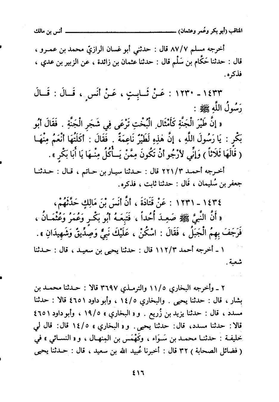 أَنَّ النَّبِيَّ صلى الله عليه وسلم صَعِدَ أُحُدًا، فَتَبِعَهُ أَبُو بَكْرٍ، وَعُمَرُ، وَعُثْمَانُ، فَرَجَفَ بِهِمُ، فَقَالَ: اسْكُنْ، نَبِيٌّ، وَصِدِّيقٌ، وَشَهِيدَانِ.