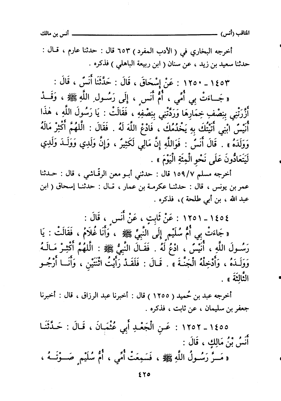 جَاءَتْ بِي أُمُّ سُلَيْمٍ إِلَى النَّبِيِّ صلى الله عليه وسلم، وَأَنَا غُلَامٌ، فَقَالَتْ: يَا رَسُولَ اللهِ، أُنَيْسٌ، ادْعُ لَهُ، فَقَالَ النَّبِيُّ صلى الله عليه وسلم: اللَّهُمَّ أَكْثِرْ مَالَهُ وَوَلَدَهُ، وَأَدْخِلْهُ الْجَنَّةَ.