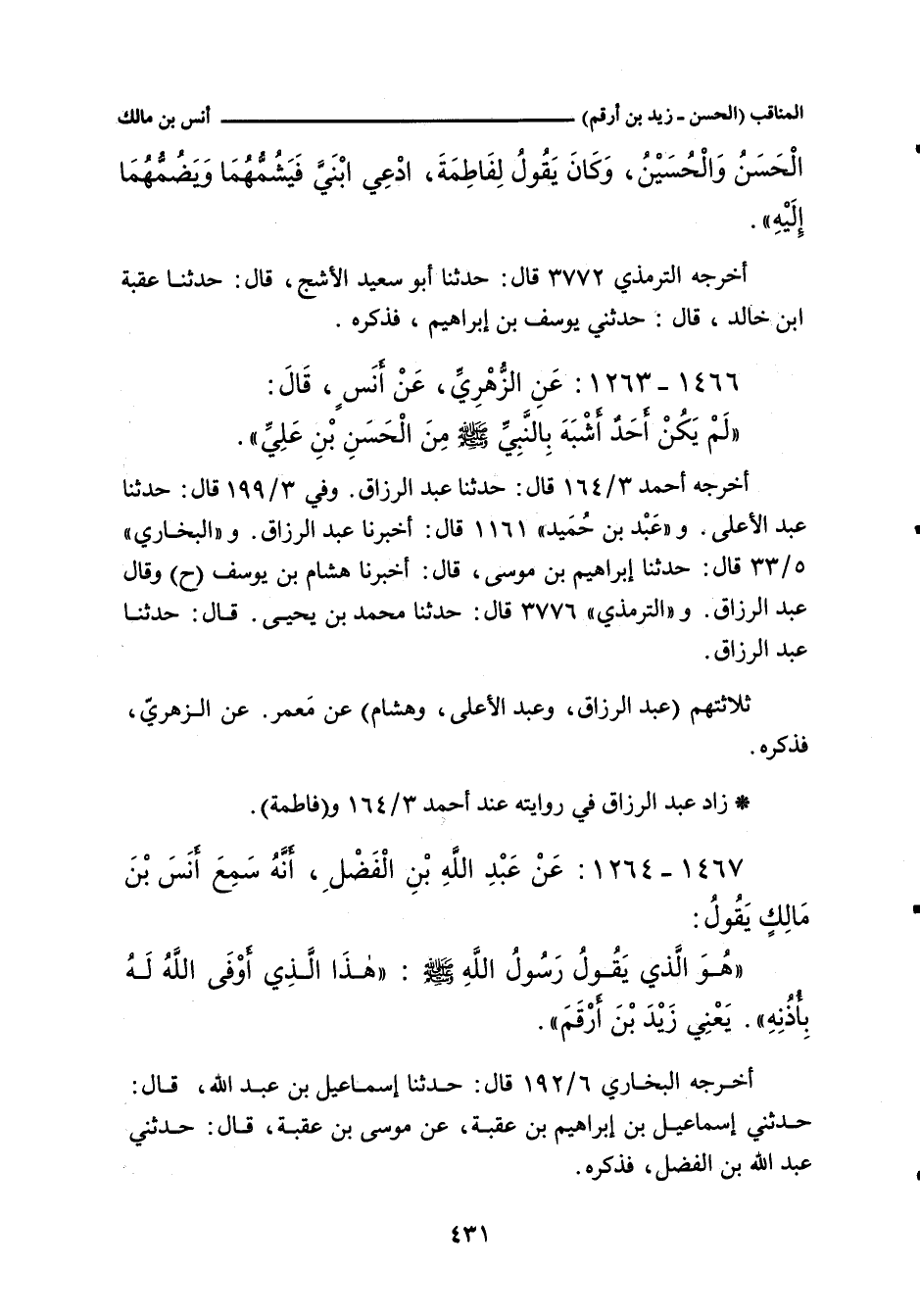 ١٤٦٧ - عَنْ أَنَسِ بْنِ مَالِكٍ، قَالَ: حَزِنْتُ عَلَى مَنْ أُصِيبَ بِالْحَرَّةِ، فَكَتَبَ إِلَيَّ زَيْدُ بْنُ أَرْقَمَ، وَبَلَغَهُ شِدَّةُ حُزْنِي، يَذْكُرُ أَنَّهُ سَمِعَ رَسُولَ اللهِ صلى الله عليه وسلم يَقُولُ: