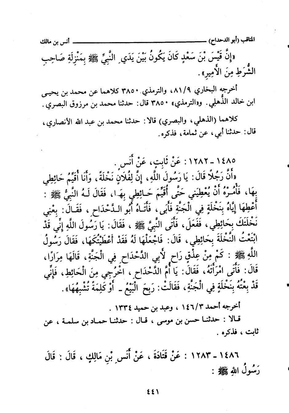 أَنَّ رَجُلاً قَالَ: يَا رَسُولَ اللهِ، إِنَّ لِفُلَانٍ نَخْلَةً، وَأَنَا أُقَيِّمُ حَائِطِي بِهَا، فَأْمُرْهُ أَنْ يُعْطِيَنِي حَتَّى أُقَيِّمَ حَائِطِي بِهَا، فَقَالَ لَهُ النَّبِيُّ صلى الله عليه وسلم: أَعْطِهَا إِيَّاهُ بِنَخْلَةٍ فِي الْجَنَّةِ، فَأَبَى، فَأَتَاهُ أَبُو الدَّحْدَاحِ، فَقَالَ: بِعْنِي نَخْلَتَكَ بِحَائِطِي، فَفَعَلَ، فَأَتَى النَّبِيَّ صلى الله عليه وسلم، فَقَالَ: يَا رَسُولَ اللهِ، إِنِّي قَدِ ابْتَعْتُ النَّخْلَةَ بِحَائِطِي، قَالَ: فَاجْعَلْهَا لَهُ فَقَدْ أَعْطَيْتُكَهَا، فَقَالَ رَسُولُ اللهِ صلى الله عليه وسلم: كَمْ مِنْ عِذْقٍ رَاحٍ لأَبِي الدَّحْدَاحِ فِي الْجَنَّةِ، قَالَهَا مِرَارًا، قَالَ: فَأَتَى امْرَأَتَهُ، فَقَالَ: يَا أُمَّ الدَّحْدَاحِ، اخْرُجِي مِنَ الْحَائِطِ، فَإِنِّي قَدْ بِعْتُهُ بِنَخْلَةٍ فِي الْجَنَّةِ، فَقَالَتْ: رَبِحَ الْبَيْعُ، أَوْ كَلِمَةً تُشْبِهُهَا.