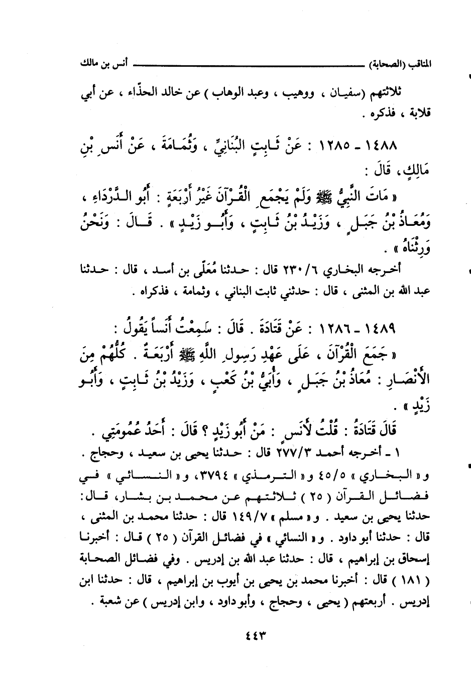 - وفي رواية: عَنْ قَتَادَةَ، قَالَ: سَأَلْتُ أَنَسَ بْنَ مَالِكٍ، رَضِيَ اللَّهُ عَنْهُ: مَنْ جَمَعَ الْقُرْآنَ عَلَى عَهْدِ النَّبِيِّ صلى الله عليه وسلم؟ قَالَ: أَرْبَعَةٌ كُلُّهُمْ مِنَ الأَنْصَارِ: أُبَيُّ بْنُ كَعْبٍ، وَمُعَاذُ ابْنُ جَبَلٍ، وَزَيْدُ بْنُ ثَابِتٍ، وَأَبُو زَيْدٍ.