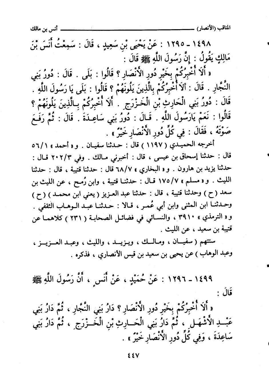 - وفي رواية: أَلَا أُخْبِرُكُمْ بِخَيْرِ دُورِ الأَنْصَارِ؟ قَالُوا: بَلَى، قَالَ: دُورُ بَنِي النَّجَّارِ، قَالَ: أَلَا أُخْبِرُكُمْ بِالَّذِينَ يَلُونَهُمْ؟ قَالُوا: نَعَمْ يَا رَسُولَ اللهِ، قَالَ: دُورُ بَنِي عَبْدِ الأَشْهَلِ، قَالَ: أَلَا أُخْبِرُكُمْ بِالَّذِينَ يَلُونَهُمْ؟ قَالُوا: بَلَى يَا رَسُولَ اللهِ، قَالَ: دُورُ بَنِي الْحَارِثِ بْنِ الْخَزْرَجِ، أَلَا أُخْبِرُكُمْ بِالَّذِينَ يَلُونَهُمْ؟ قَالُوا: نَعَمْ يَا رَسُولَ اللهِ، قَالَ: دُورُ بَنِي سَاعِدَةَ، قَالَ: ثُمَّ رَفَعَ صَوْتَهُ، فَقَالَ: فِي كُلِّ دُورِ الأَنْصَارِ خَيْرٌ.