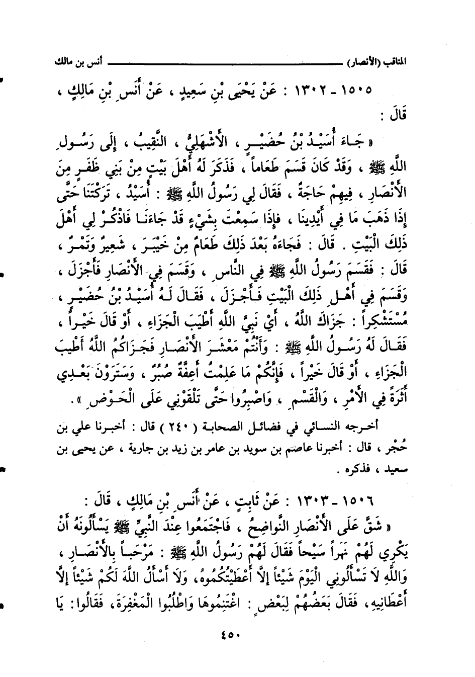 جَاءَ أُسَيْدُ بْنُ حُضَيْرٍ، الأَشْهَلِيُّ النَّقِيبُ، إِلَى رَسُولِ اللهِ صلى الله عليه وسلم، وَقَدْ كَانَ قَسَمَ طَعَامًا، فَذَكَرَ لَهُ أَهْلَ بَيْتٍ مِنْ بَنِي ظَفَرٍ مِنَ الأَنْصَارِ، فِيهِمْ حَاجَةٌ، فَقَالَ لِي رَسُولُ اللهِ صلى الله عليه وسلم: أُسَيْدُ، تَرَكْتَنَا حَتَّى إِذَا ذَهَبَ مَا فِي أَيْدِينَا، فَإِذَا سَمِعْتَ بِشَيْءٍ قَدْ جَاءَنَا، فَاذْكُرْ لِي أَهْلَ ذَلِكَ الْبَيْتِ، قَالَ: فَجَاءَهُ بَعْدَ ذَلِكَ طَعَامٌ مِنْ خَيْبَرَ، شَعِيرٌ وَتَمْرٌ، قَالَ: فَقَسَمَ رَسُولُ اللهِ صلى الله عليه وسلم فِي النَّاسِ، وَقَسَمَ فِي الأَنْصَارِ فَأَجْزَلَ، وَقَسَمَ فِي أَهْلِ ذَلِكَ الْبَيْتِ فَأَجْزَلَ، فَقَالَ لَهُ أُسَيْدُ بْنُ حُضَيْرٍ مُسْتَشْكِرًا: جَزَاكَ اللَّهُ أَيْ نَبِيَّ اللهِ أَطْيَبَ الْجَزَاءِ، أَوْ قَالَ خَيْرًا، فَقَالَ رَسُولُ اللهِ صلى الله عليه وسلم: وَأَنْتُمْ مَعْشَرَ الأَنْصَارِ، فَجَزَاكُمُ اللَّهُ أَطْيَبَ الْجَزَاءِ، أَوْ قَالَ خَيْرًا، فَإِنَّكُمْ - مَا عَلِمْتُ - أَعِفَّةٌ صُبُرٌ، وَسَتَرَوْنَ بَعْدِي أَثَرَةً فِي الأَمْرِ، وَالْقَسَمِ، فَاصْبِرُوا حَتَّى تَلْقَوْنِي عَلَى الْحَوْضِ.