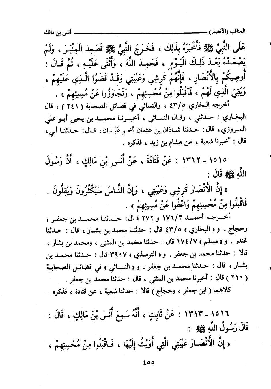 - أخرجه النَّسَائِي، في "الكبرى" ٨٢٦٦ قال: أخبرنا مُحَمد بن مَعْمَر، قال: حدَّثني حَرَمِي بن عُمَارة، قال: حدَّثنا شُعْبة، عن قَتَادَة، عن أَنَسٍ، عَنْ أُسَيْدِ بْنِ حُضَيْرٍ، قَالَ: قَالَ رَسُولُ اللهِ صلى الله عليه وسلم: