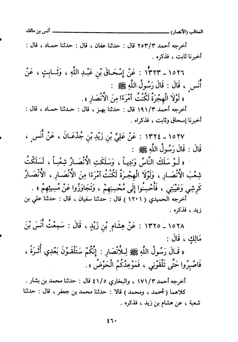 لَوْ سَلَكَ النَّاسُ وَادِيًا، وَسَلَكَتِ الأَنْصَارُ شِعْبًا، لَسَلَكْتُ شِعْبَ الأَنْصَارِ، وَلَوْلَا الْهِجْرَةُ لَكُنْتُ امْرَءًا مِنَ الأَنْصَارِ، الأَنْصَارُ كَرِشِي وَعَيْبَتِي، فَأَحْسِنُوا إِلَى مُحْسِنِهِمْ، وَتَجَاوَزُوا عَنْ مُسِيئِهِمْ.
