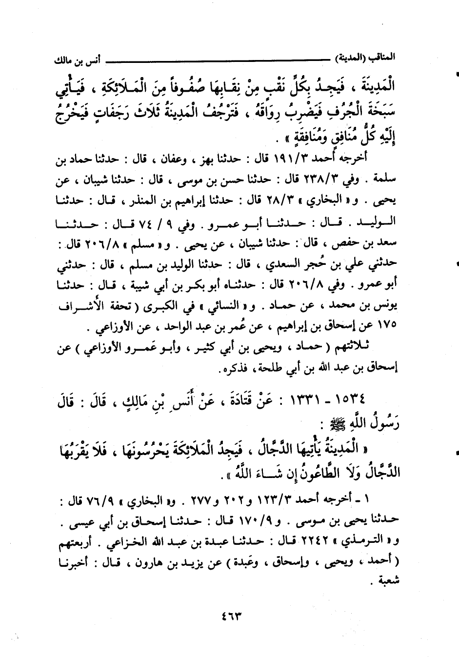 - وفي رواية: لَيْسَ مِنْ بَلَدٍ إِلَاّ سَيَطَؤُهُ الدَّجَّالُ، إِلَاّ مَكَّةَ وَالْمَدِينَةَ، وَلَيْسَ نَقْبٌ مِنْ أَنْقَابِهَا إِلَاّ عَلَيْهِ الْمَلَائِكَةُ صَافِّينَ تَحْرُسُهَا، فَيَنْزِلُ بِالسَّبَخَةِ، فَتَرْجُفُ الْمَدِينَةُ ثَلَاثَ رَجَفَاتٍ، يَخْرُجُ إِلَيْهِ مِنْهَا كُلُّ كَافِرٍ وَمُنَافِقٍ.