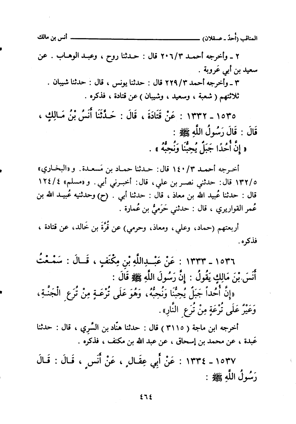 - وفي رواية: نَظَرَ رَسُولُ اللهِ صلى الله عليه وسلم إِلَى أُحُدٍ، فَقَالَ: إِنَّ أُحُدًا جَبَلٌ يُحِبُّنَا وَنُحِبُّهُ.