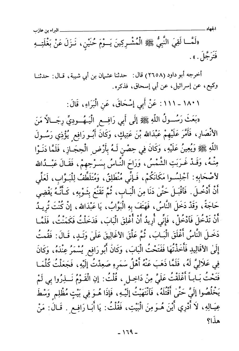 بَعَثَ رَسُولُ اللهِ صلى الله عليه وسلم إِلَى أَبِي رَافِعٍ الْيَهُودِيِّ، رِجَالاً مِنَ الأَنْصَارِ، فَأَمَّرَ عَلَيْهِمْ عَبْدَ اللهِ بْنَ عَتِيكٍ، وَكَانَ أَبُو رَافِعٍ يُؤْذِي رَسُولَ اللهِ صلى الله عليه وسلم، وَيُعِينُ عَلَيْهِ، وَكَانَ فِي حِصْنٍ لَهُ بِأَرْضِ الْحِجَازِ، فَلَمَّا دَنَوْا مِنْهُ، وَقَدْ غَرَبَتِ الشَّمْسُ، وَرَاحَ النَّاسُ بِسَرْحِهِمْ، فَقَالَ عَبْدُ اللهِ لأَصْحَابِهِ: اجْلِسُوا مَكَانَكُمْ، فَإِنِّي مُنْطَلِقٌ، وَمُتَلَطِّفٌ لِلْبَوَّابِ، لَعَلِّيَ أَنْ أَدْخُلَ، فَأَقْبَلَ حَتَّى دَنَا مِنَ الْبَابِ، ثُمَّ تَقَنَّعَ بِثَوْبِهِ، كَأَنَّهُ يَقْضِي حَاجَةً، وَقَدْ دَخَلَ النَّاسُ، فَهَتَفَ بِهِ الْبَوَّابُ: يَا عَبْدَ اللهِ، إِنْ كُنْتَ تُرِيدُ أَنْ تَدْخُلَ فَادْخُلْ، فَإِنِّي أُرِيدُ أَنْ أُغْلِقَ الْبَابَ، فَدَخَلْتُ فَكَمَنْتُ، فَلَمَّا دَخَلَ النَّاسُ أَغْلَقَ الْبَابَ، ثُمَّ عَلَّقَ الأَغَالِيقَ عَلَى وَتَدٍ، قَالَ: فَقُمْتُ إِلَى الأَقَالِيدِ، فَأَخَذْتُهَا، فَفَتَحْتُ الْبَابَ، وَكَانَ أَبُو رَافِعٍ يُسْمَرُ عِنْدَهُ، وَكَانَ فِي عَلَالِيَّ لَهُ، فَلَمَّا ذَهَبَ عَنْهُ أَهْلُ سَمَرِهِ، صَعِدْتُ إِلَيْهِ، فَجَعَلْتُ كُلَّمَا فَتَحْتُ بَابًا أَغْلَقْتُ عَلَيَّ مِنْ دَاخِلٍ، قُلْتُ: إِنِ الْقَوْمُ نَذِرُوا بِي لَمْ يَخْلُصُوا إِلَيَّ حَتَّى أَقْتُلَهُ، فَانْتَهَيْتُ إِلَيْهِ، فَإِذَا هُوَ فِي بَيْتٍ مُظْلِمٍ وَسْطَ عِيَالِهِ، لَا أَدْرِي أَيْنَ هُوَ مِنَ الْبَيْتِ، فَقُلْتُ: يَا أَبَا رَافِعٍ، قَالَ: مَنْ هَذَا؟