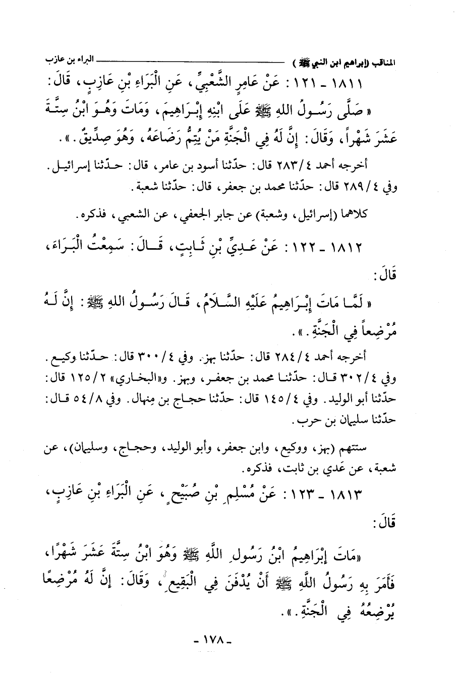 - لفظ شُعْبة: عَنِ الْبَرَاءِ بْنِ عَازِبٍ , عَنِ النَّبِيِّ صلى الله عليه وسلم , أَنَّهُ قَالَ، فِي ابْنِهِ إِبْرَاهِيمَ: إِنَّ لَهُ مُرْضِعًا يُرْضِعُهُ فِي الْجَنَّةِ.