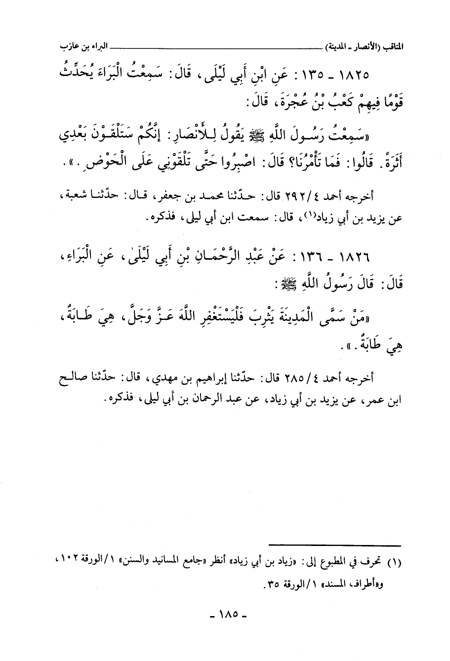 ١٨٢٥ - عَنِ ابْنِ أَبِي لَيْلَى، قَالَ: سَمِعْتُ الْبَرَاءَ يُحَدِّثُ قَوْمًا، فِيهِمْ كَعْبُ بْنُ عُجْرَةَ، قَالَ: