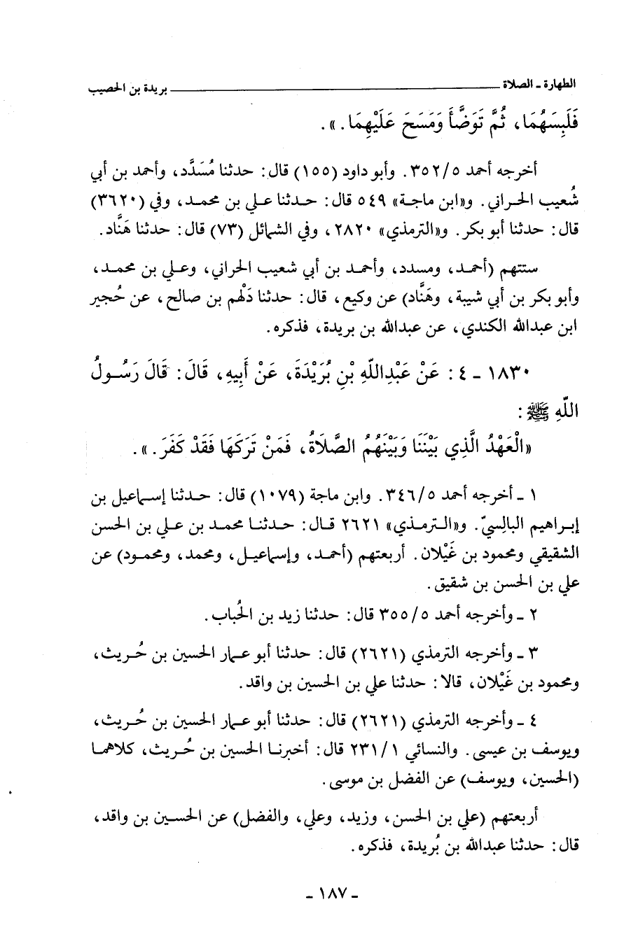 - وفي رواية: الْعَهْدُ الَّذِي بَيْنَنَا وَبَيْنَهُمُ الصَّلَاةُ، فَمَنْ تَرَكَهَا فَقَدْ كَفَرَ.