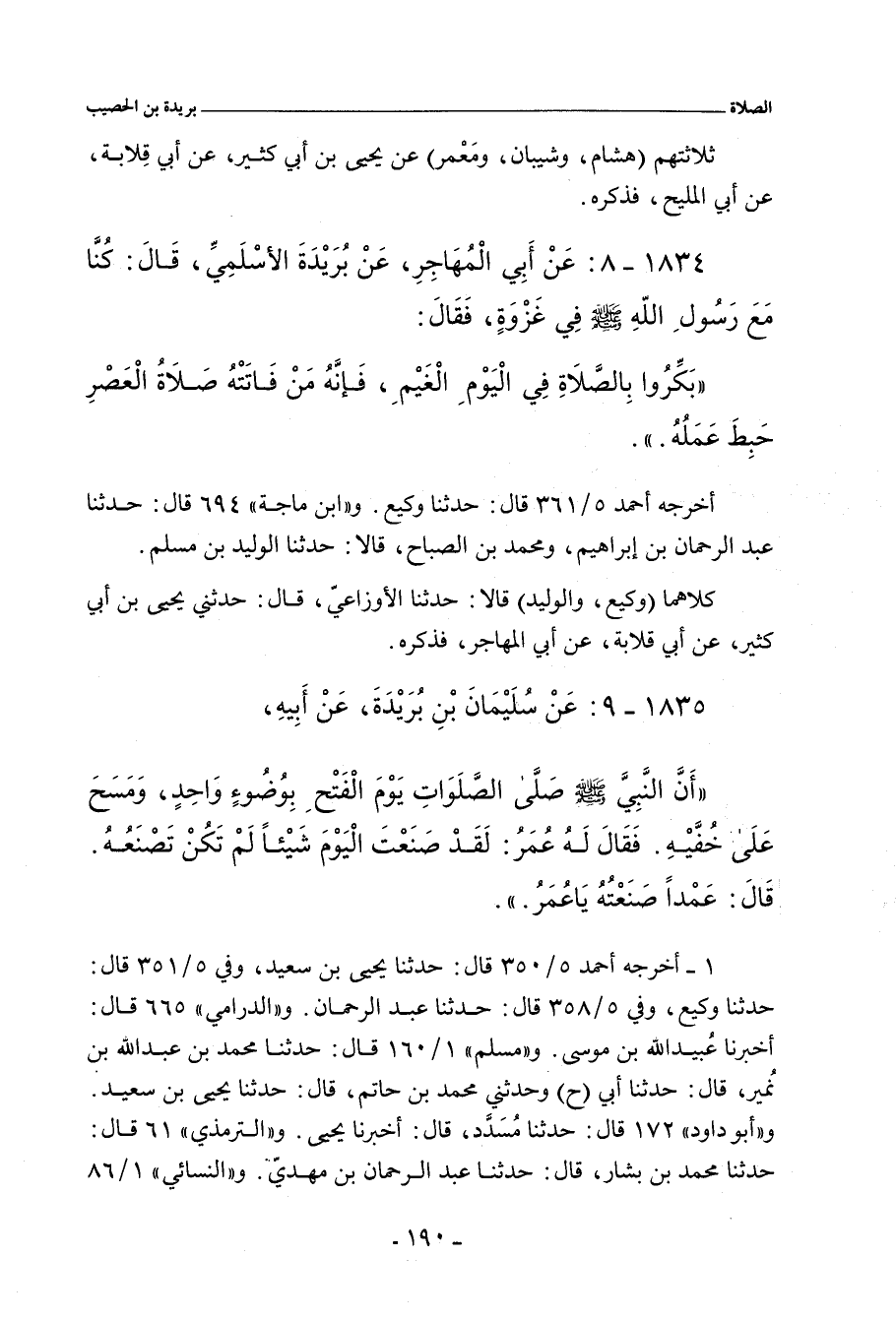 - وفي رواية: كُنَّا مَعَ رَسُولِ اللهِ صلى الله عليه وسلم فِي غَزْوَةٍ، فَقَالَ: بَكِّرُوا بِالصَّلَاةِ فِي الْيَوْمِ الْغَيْمِ، فَإِنَّهُ مَنْ فَاتَتْهُ صَلَاةُ الْعَصْرِ حَبِطَ عَمَلُهُ.