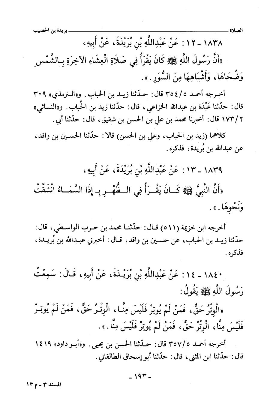 - لفظ أحمد: الْوِتْرُ حَقٌّ، فَمَنْ لَمْ يُوتِرْ فَلَيْسَ مِنَّا. قَالَهَا ثَلَاثًا.