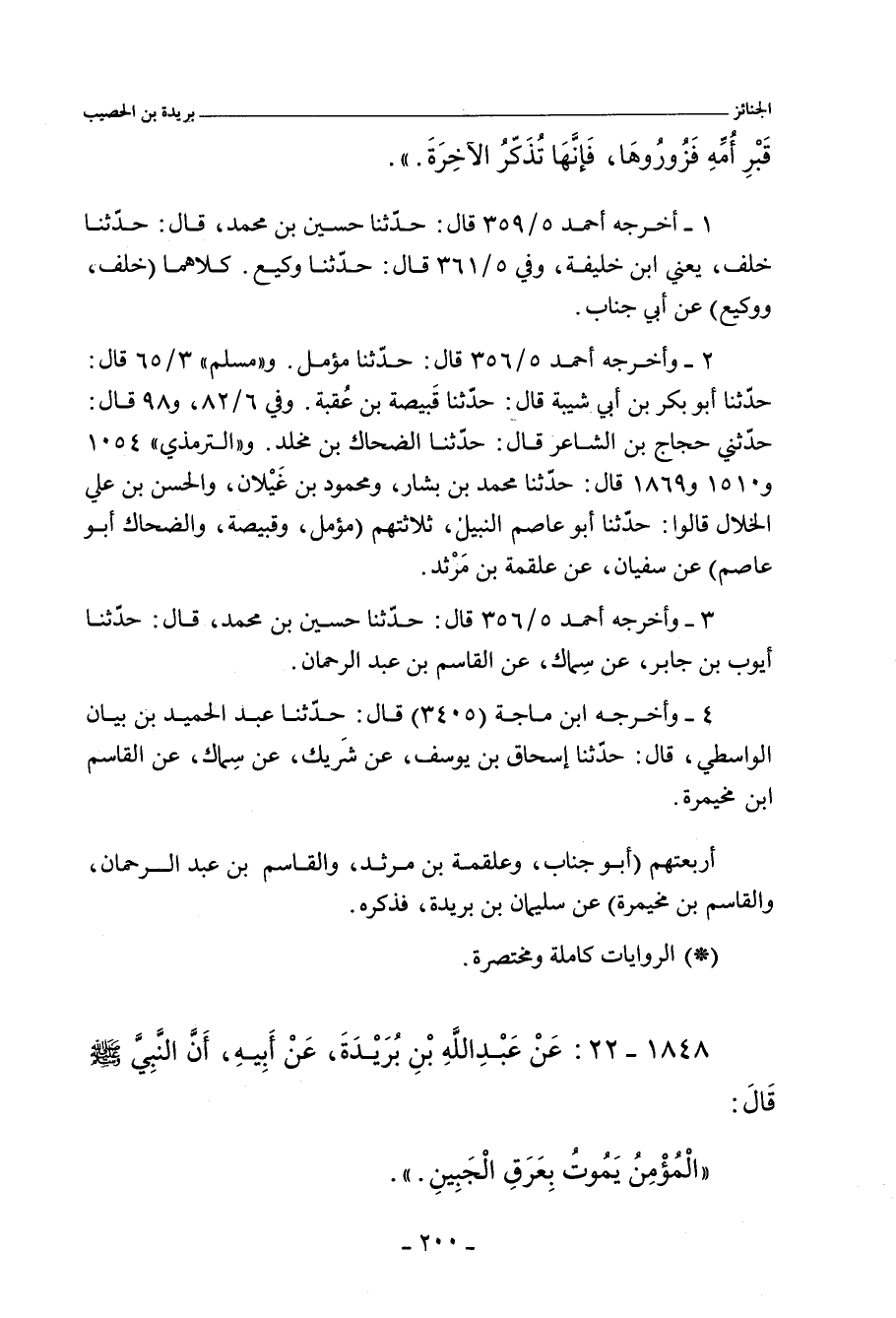- وفي رواية: عَنْ عَبْدِ اللهِ بْنِ بُرَيْدَةَ، عَنْ أَبِيهِ، أَنَّهُ دَخَلَ، فَرَأَى ابْنًا لَهُ يَرْشَحُ جَبِينُهُ، فَقَالَ: سَمِعْتُ رَسُولَ اللهِ صلى الله عليه وسلم يَقُولُ: يَمُوتُ الْمُؤْمِنُ بِعَرَقِ الْجَبِينِ.
