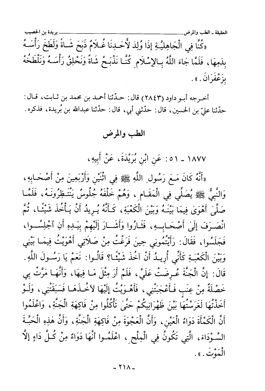 - لفظ واصل: الْكَمْأَةُ دَوَاءُ الْعَيْنِ، وَإِنَّ الْعَجْوَةَ مِنْ فَاكِهَةِ الْجَنَّةِ، وَإِنَّ هَذِهِ الْحَبَّةَ السَّوْدَاءَ - قَالَ ابْنُ بُرَيْدَةَ: يَعْنِي الشُّونِيزَ الَّذِي يَكُونُ فِي الْمِلْحِ - دَوَاءٌ مِنْ كُلِّ دَاءٍ، إِلَاّ الْمَوْتَ.