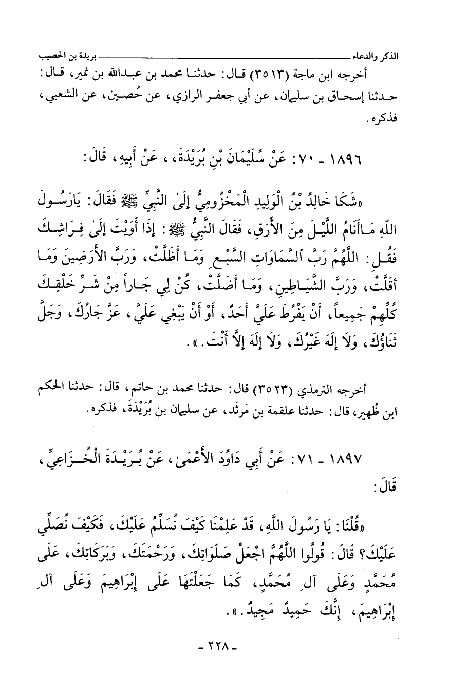 شَكَا خَالِدُ بْنُ الْوَلِيدِ الْمَخْزُومِيُّ إِلَى النَّبِيِّ صلى الله عليه وسلم، فَقَالَ: يَا رَسُولَ اللهِ، مَا أَنَامُ اللَّيْلَ مِنَ الأَرَقِ، فَقَالَ النَّبِيُّ صلى الله عليه وسلم: إِذَا أَوَيْتَ إِلَى فِرَاشِكَ فَقُلِ: اللَّهُمَّ رَبَّ السَّمَاوَاتِ السَّبْعِ وَمَا أَظَلَّتْ، وَرَبَّ الأَرَضِينَ وَمَا أَقَلَّتْ، وَرَبَّ الشَّيَاطِينِ وَمَا أَضَلَّتْ، كُنْ لِي جَارًا مِنْ شَرِّ خَلْقِكَ كُلِّهِمْ جَمِيعًا، أَنْ يَفْرُطَ عَلَيَّ أَحَدٌ، أَوْ أَنْ يَبْغِيَ عَلَيَّ، عَزَّ جَارُكَ، وَجَلَّ ثَنَاؤُكَ، وَلَا إِلَهَ غَيْرُكَ، وَلَا إِلَهَ إِلَاّ أَنْتَ.