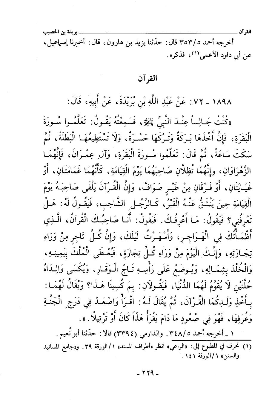 كُنْتُ جَالِسًا عِنْدَ النَّبِيِّ صلى الله عليه وسلم، فَسَمِعْتُهُ يَقُولُ: تَعَلَّمُوا سُورَةَ الْبَقَرَةِ، فَإِنَّ أَخْذَهَا بَرَكَةٌ، وَتَرْكَهَا حَسْرَةٌ، وَلَا يَسْتَطِيعُهَا الْبَطَلَةُ، قَالَ: ثُمَّ سَكَتَ سَاعَةً، ثُمَّ قَالَ: تَعَلَّمُوا سُورَةَ الْبَقَرَةِ، وَآلِ عِمْرَانَ، فَإِنَّهُمَا الزَّهْرَاوَانِ، يُظِلَاّنِ صَاحِبَهُمَا يَوْمَ الْقِيَامَةِ، كَأَنَّهُمَا غَمَامَتَانِ، أَوْ غَيَايَتَانِ، أَوْ فِرْقَانِ مِنْ طَيْرٍ صَوَافَّ، وَإِنَّ الْقُرْآنَ يَلْقَى صَاحِبَهُ يَوْمَ الْقِيَامَةِ، حِينَ يَنْشَقُّ عَنْهُ قَبْرُهُ، كَالرَّجُلِ الشَّاحِبِ، فَيَقُولُ لَهُ: هَلْ تَعْرِفُنِي؟ فَيَقُولُ: مَا أَعْرِفُكَ، فَيَقُولُ: أَنَا صَاحِبُكَ الْقُرْآنُ، الَّذِي أَظْمَأْتُكَ فِي الْهَوَاجِرِ، وَأَسْهَرْتُ لَيْلَكَ، وَإِنَّ كُلَّ تَاجِرٍ مِنْ وَرَاءِ تِجَارَتِهِ، وَإِنَّكَ الْيَوْمَ مِنْ وَرَاءِ كُلِّ تِجَارَةٍ، فَيُعْطَى الْمُلْكَ بِيَمِينِهِ، وَالْخُلْدَ بِشِمَالِهِ، وَيُوضَعُ عَلَى رَأْسِهِ تَاجُ الْوَقَارِ، وَيُكْسَى وَالِدَاهُ حُلَّتَيْنِ لَا يُقَوَّمُ لَهُمَا أَهْلُ الدُّنْيَا، فَيَقُولَانِ: بِمَ كُسِينَا هَذَا؟ فَيُقَالُ: بِأَخْذِ وَلَدِكُمَا الْقُرْآنَ، ثُمَّ يُقَالُ لَهُ: اقْرَأْ وَاصْعَدْ فِي دَرَجِ الْجَنَّةِ وَغُرَفِهَا، فَهُوَ فِي صُعُودٍ مَا دَامَ يَقْرَأُ، هَذًّا كَانَ، أَوْ تَرْتِيلاً.