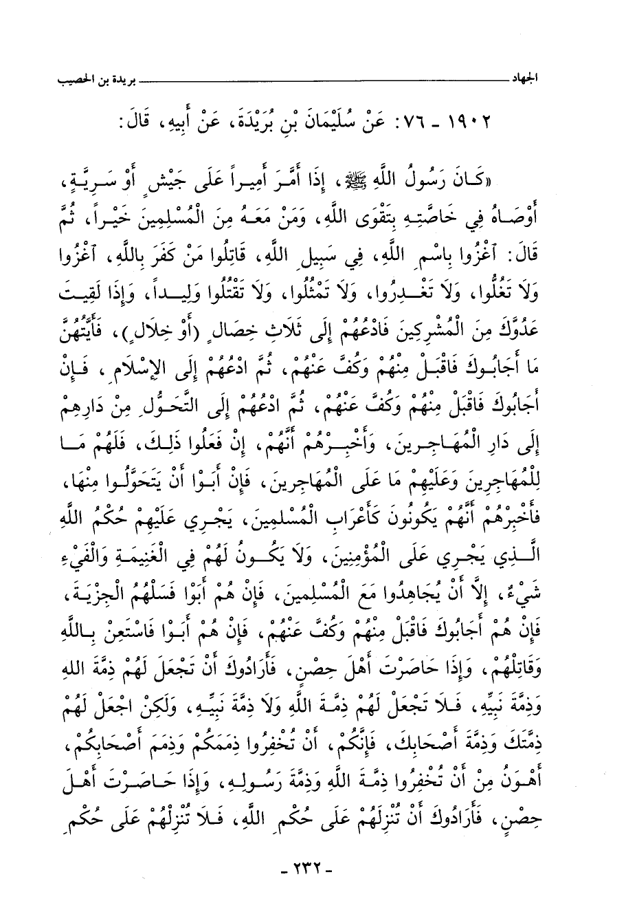 كَانَ رَسُولُ اللهِ صلى الله عليه وسلم إِذَا أَمَّرَ أَمِيرًا عَلَى جَيْشٍ، أَوْ سَرِيَّةٍ، أَوْصَاهُ فِي خَاصَّتِهِ بِتَقْوَى اللهِ، وَمَنْ مَعَهُ مِنَ الْمُسْلِمِينَ خَيْرًا، ثُمَّ قَالَ: اغْزُوا بِاسْمِ اللهِ، فِي سَبِيلِ اللهِ، قَاتِلُوا مَنْ كَفَرَ بِاللهِ، اغْزُوا، وَلَا تَغُلُّوا، وَلَا تَغْدِرُوا، وَلَا تَمْثُلُوا، وَلَا تَقْتُلُوا وَلِيدًا، وَإِذَا لَقِيتَ عَدُوَّكَ مِنَ الْمُشْرِكِينَ، فَادْعُهُمْ إِلَى ثَلَاثِ خِصَالٍ، أَوْ خِلَالٍ، فَأَيَّتُهُنَّ مَا أَجَابُوكَ فَاقْبَلْ مِنْهُمْ، وَكُفَّ عَنْهُمْ، ادْعُهُمْ إِلَى الإِسْلَامِ، فَإِنْ أَجَابُوكَ فَاقْبَلْ مِنْهُمْ، وَكُفَّ عَنْهُمْ، ثُمَّ ادْعُهُمْ إِلَى التَّحَوُّلِ مِنْ دَارِهِمْ إِلَى دَارِ الْمُهَاجِرِينَ، وَأَخْبِرْهُمْ أَنَّهُمْ، إِنْ فَعَلُوا ذَلِكَ، فَلَهُمْ مَا لِلْمُهَاجِرِينَ، وَعَلَيْهِمْ مَا عَلَى الْمُهَاجِرِينَ، فَإِنْ أَبَوْا أَنْ يتَحَوَّلُوا مِنْهَا، فَأَخْبِرْهُمْ أَنَّهُمْ يَكُونُونَ كَأَعْرَابِ الْمُسْلِمِينَ، يَجْرِي عَلَيْهِمْ حُكْمُ اللهِ الَّذِي يَجْرِي عَلَى الْمُؤْمِنِينَ، وَلَا يَكُونُ لَهُمْ فِي الْغَنِيمَةِ وَالْفَيْءِ شَيْءٌ، إِلَاّ أَنْ يُجَاهِدُوا مَعَ الْمُسْلِمِينَ، فَإِنْ هُمْ أَبَوْا، فَسَلْهُمُ الْجِزْيَةَ، فَإِنْ هُمْ أَجَابُوكَ، فَاقْبَلْ مِنْهُمْ، وَكُفَّ عَنْهُمْ، فَإِنْ هُمْ أَبَوْا، فَاسْتَعِنْ بِاللهِ وَقَاتِلْهُمْ، وَإِذَا حَاصَرْتَ أَهْلَ حِصْنٍ، فَأَرَادُوكَ أَنْ تَجْعَلَ لَهُمْ ذِمَّةَ اللهِ وَذِمَّةَ نَبِيِّهِ، فَلَا تَجْعَلْ لَهُمْ ذِمَّةَ اللهِ، وَلَا ذِمَّةَ نَبِيِّهِ، وَلَكِنِ اجْعَلْ لَهُمْ ذِمَّتَكَ وَذِمَّةَ أَصْحَابِكَ، فَإِنَّكُمْ أَنْ تُخْفِرُوا