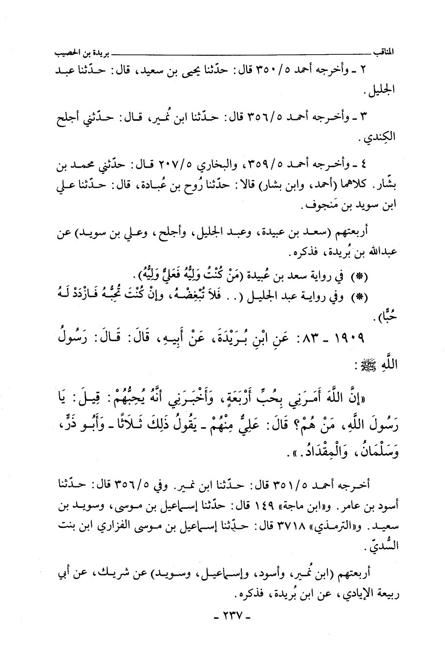 - وفي رواية: إِنَّ اللهَ أَمَرَنِي بِحُبِّ أَرْبَعَةٍ، وَأَخْبَرَنِي أَنَّهُ يُحِبُّهُمْ. قِيلَ: يَا رَسُولَ اللهِ، مَنْ هُمْ؟ قَالَ: عَلِيٌّ مِنْهُمْ، يَقُولُ ذَلِكَ ثَلَاثًا، وَأَبُو ذَرٍّ، وَسَلْمَانُ، وَالْمِقْدَادُ.