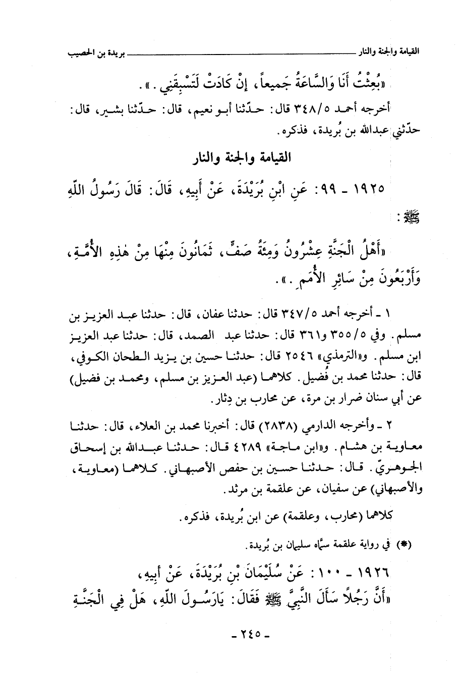 - وفي رواية: أَهْلُ الْجَنَّةِ عِشْرُونَ وَمِئَةُ صَفٍّ، هَذِهِ الأُمَّةُ مِنْهَا ثَمَانُونَ صَفًّا.
