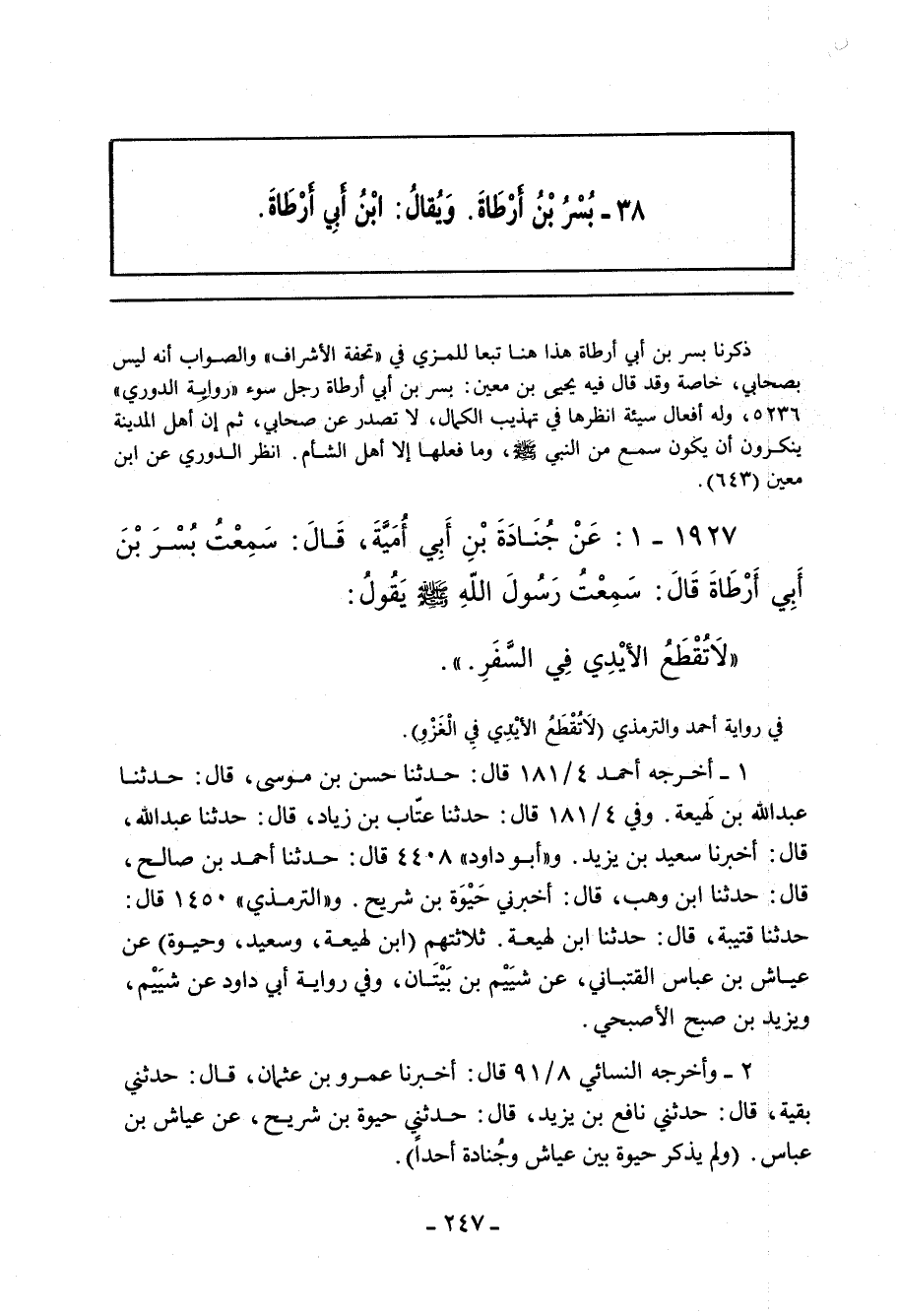- قال أبو عِيسَى التِّرْمِذِي: هذا حديثٌ غريبٌ، وقد روى غير ابن لَهِيعَة، بهذا الإسناد، نَحْوَ هذا. ويُقال: بُسْر بن أَبي أَرْطَاة أيضًا.