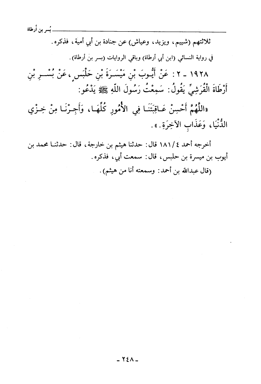 ١٩٢٨ - عَنْ أَيُّوبَ بْنِ مَيْسَرَةَ بْنِ حَلْبَسٍ، عَنْ بُسْرِ بْنِ أَرْطَاةَ الْقُرَشِيِّ، قَالَ: سَمِعْتُ رَسُولَ اللهِ صلى الله عليه وسلم يَدْعُو: