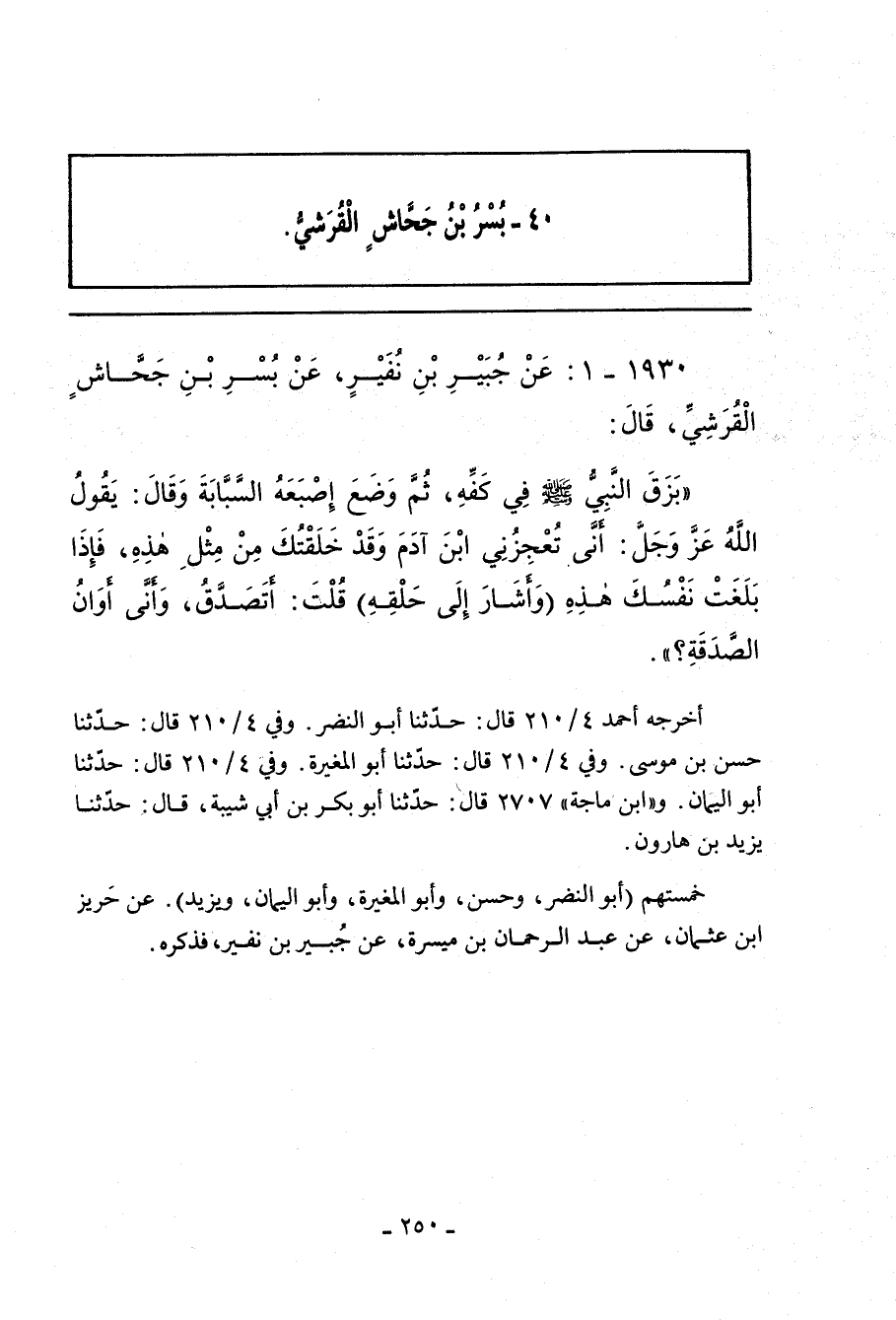 ١٩٣٠ - عَنْ جُبَيْرِ بْنِ نُفَيْرٍ، عَنْ بُسْرِ بْنِ جَحَّاشٍ الْقُرَشِيِّ؛