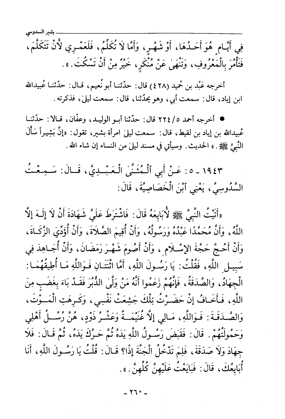 - أخرجه أحمد ٥/ ٢٢٤ (٢٢٣٠٠) قال: حدَّثنا أبو الوَلِيد، وعَفَّان، قالا: حدَّثنا عُبَيْد اللهِ ابن إِيَاد بن لَقِيط، سَمِعْتُ إِيَادَ بْنَ لَقِيطٍ يَقُولُ: سَمِعْتُ لَيْلَى امْرَأَةَ بَشِيرٍ؛
