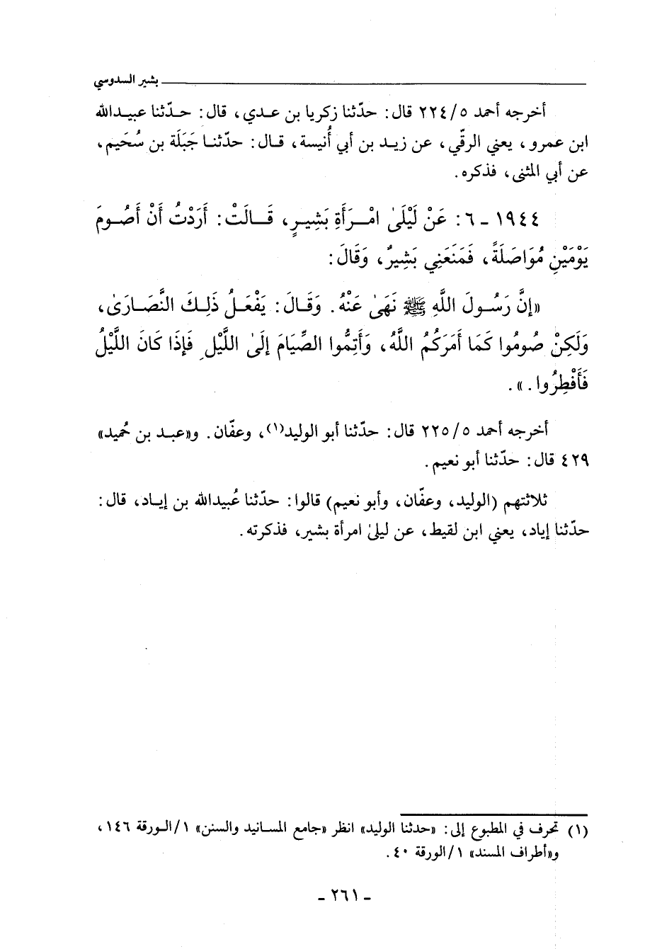 ١٩٤٤ - عَنْ لَيْلَى امْرَأَةِ بَشِيرٍ، قَالَتْ: أَرَدْتُ أَنْ أَصُومَ يَوْمَيْنِ مُوَاصَلَةً، فَمَنَعَنِي بَشِيرٌ، وَقَالَ: