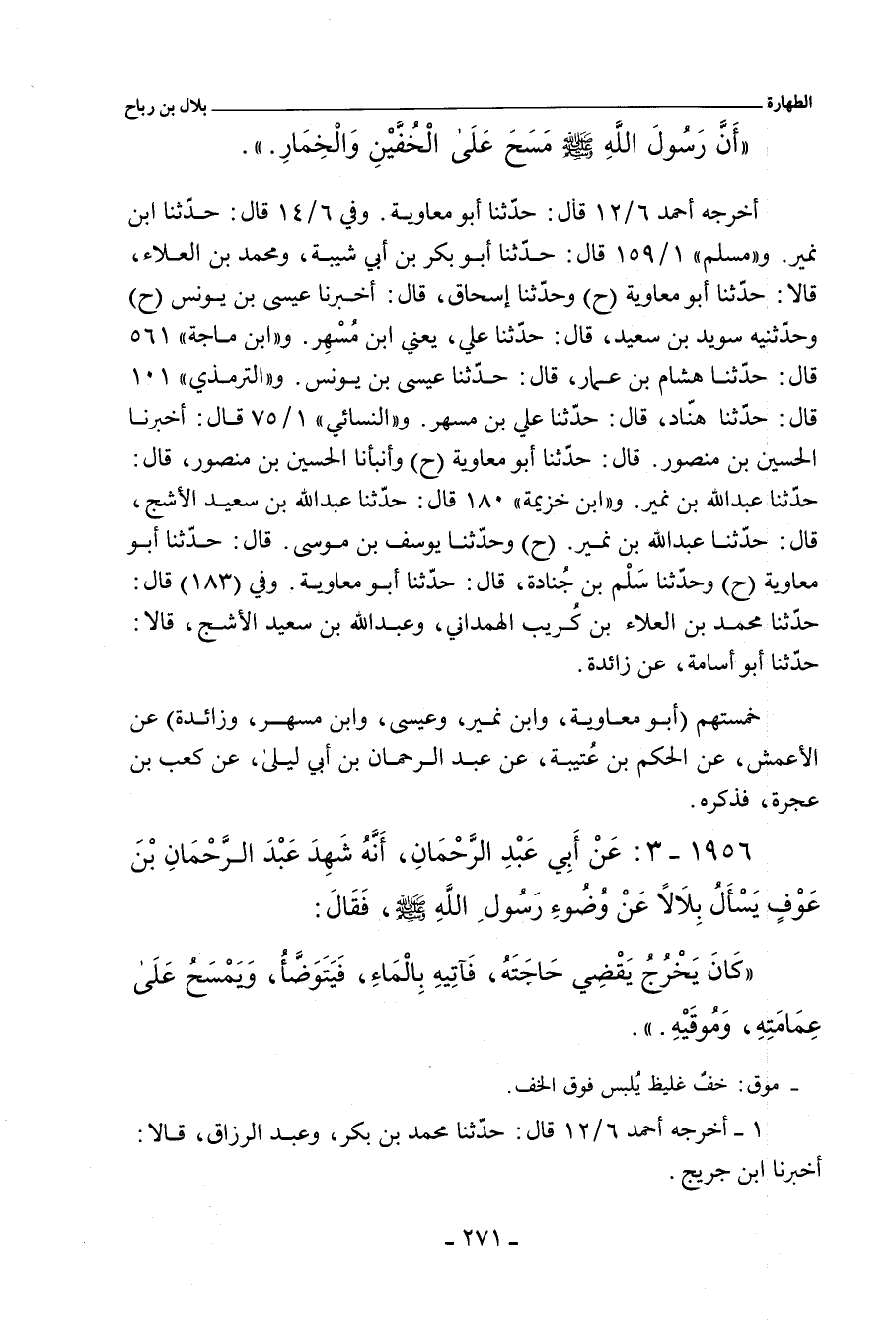 - وفي رواية: عَنْ أَبِي عَبْدِ الرَّحْمَانِ السُّلَمِيِّ، أَنَّهُ شَهِدَ عَبْدَ الرَّحْمَانِ بْنَ عَوْفٍ يَسْأَلُ بِلَالاً عَنْ وُضُوءِ رَسُولِ اللهِ صلى الله عليه وسلم، فَقَالَ: