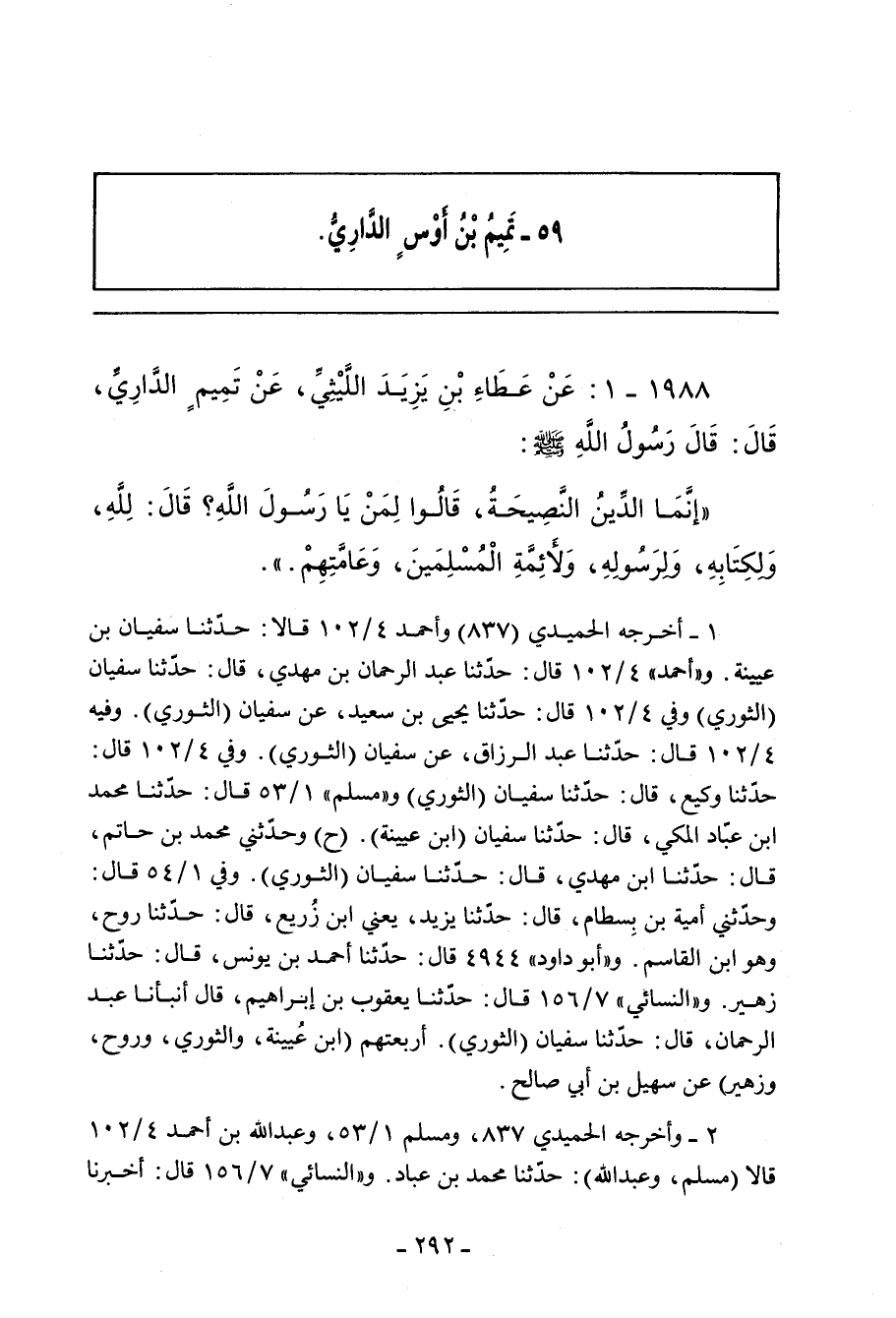 ١٩٨٨ - عَنْ عَطَاءِ بْنِ يَزِيدَ اللَّيْثِيِّ، عَنْ تَمِيمٍ الدَّارِيِّ، أَنَّ رَسُول اللهِ صلى الله عليه وسلم قَالَ:
