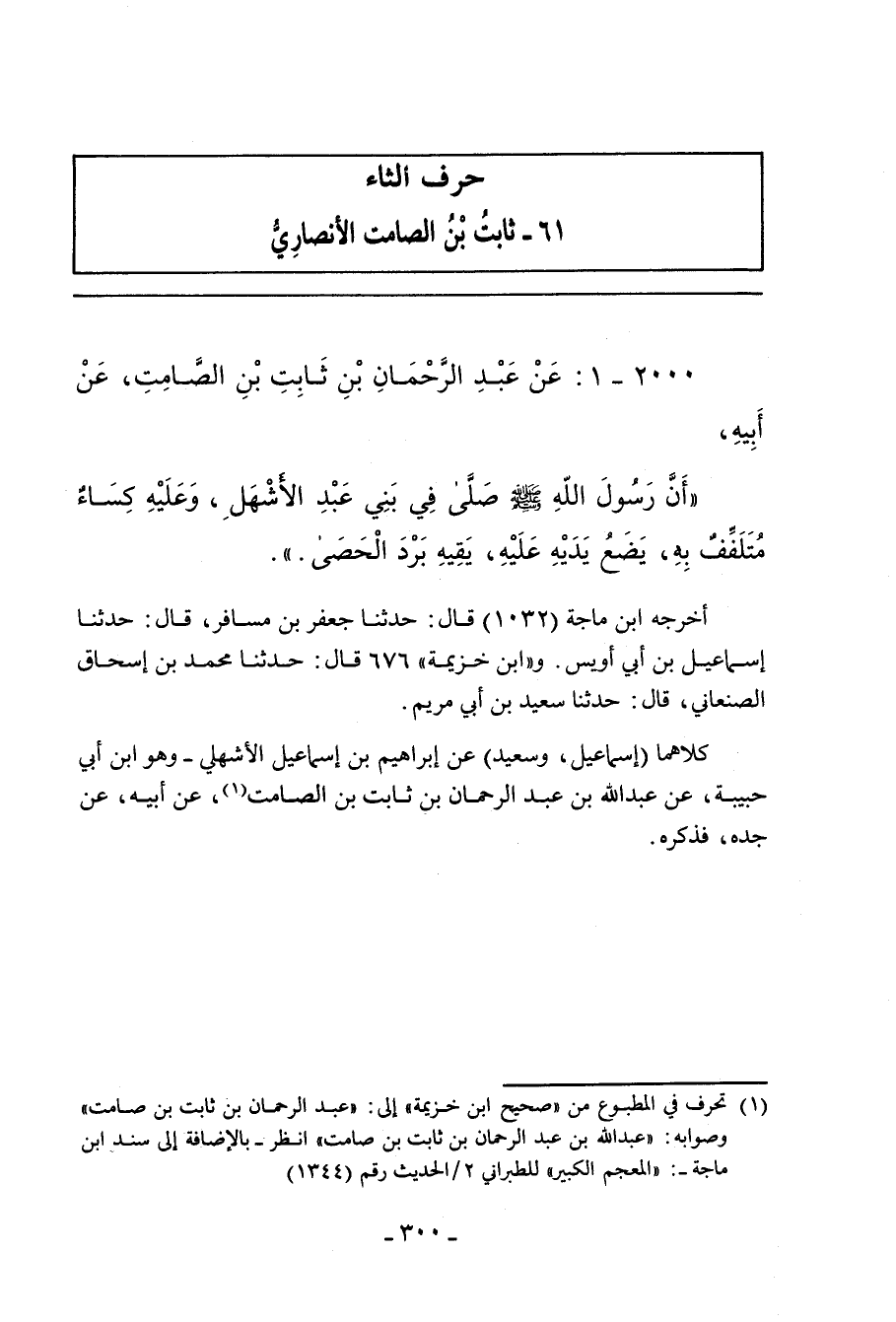 - أخرجه ابن خُزَيْمَة (٦٧٦) قال: حدَّثنا مُحَمد بن إِسْحَاق الصَّغَانِي، حدَّثنا سَعِيد بن أَبي مَرْيَم، حدَّثنا إبراهيم بن إِسْمَاعِيل بن أَبي حَبِيبَة، حدَّثني عَبْد الرَّحْمان بن عَبْد الرَّحْمان بن ثابت بن صامت، عن أبيه، عن جَدِّه؛