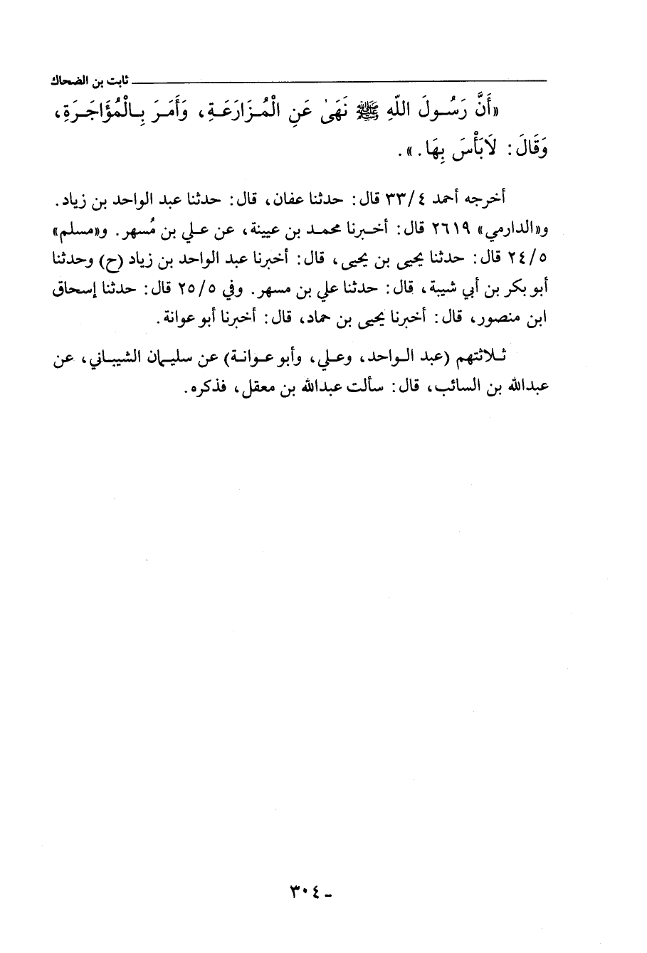- وفي رواية: عَنْ عَبْدِ اللهِ بْنِ السَّائِبِ، قَالَ: سَأَلْتُ عَبْدَ اللهِ بْنَ مَعْقِلٍ عَنِ الْمُزَارَعَةِ؟ فَقَالَ: أَخْبَرَنِي ثَابِتُ بْنُ الضَّحَّاكِ، أَنَّ رَسُولَ اللهِ صلى الله عليه وسلم نَهَى عَنِ الْمُزَارَعَةِ.
