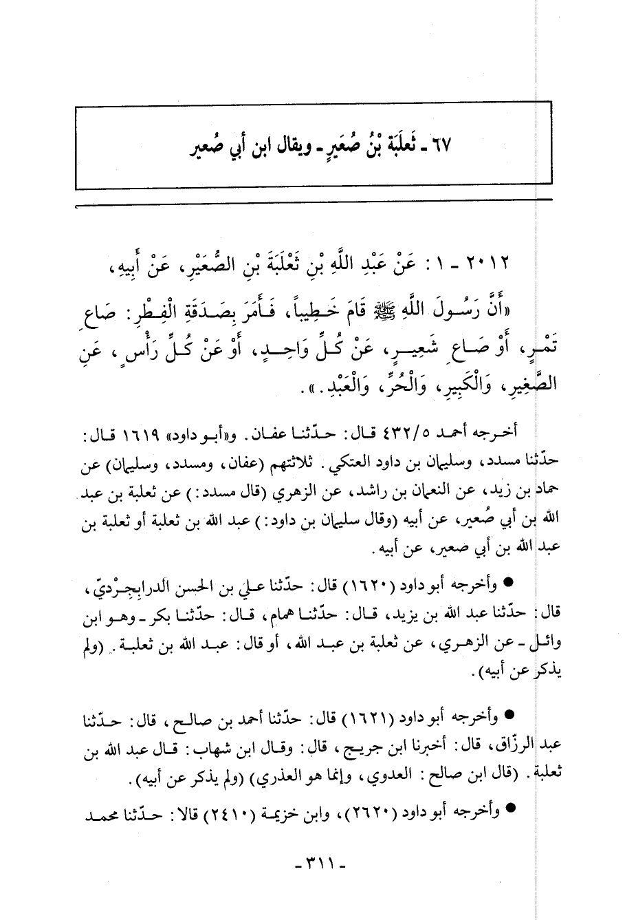 ٢٠١٢ - عَنْ عَبْدِ اللهِ بْنِ ثَعْلَبَةَ بْنِ صُّعَيْرِ، عَنْ أَبِيهِ، قَالَ: