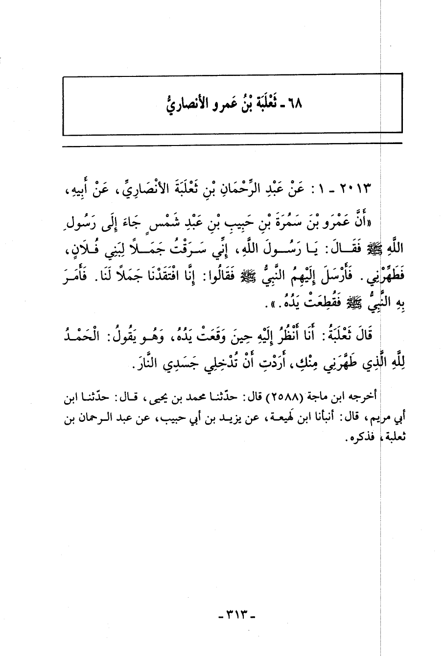 قَالَ ثَعْلَبَةُ: أَنَا أَنْظُرُ إِلَيْهِ حِينَ وَقَعَتْ يَدُهُ، وَهُوَ يَقُولُ: الْحَمْدُ ِللهِ الَّذِي طَهَّرَنِي مِنْكِ، أَرَدْتِ أَنْ تُدْخِلِي جَسَدِي النَّارَ.
