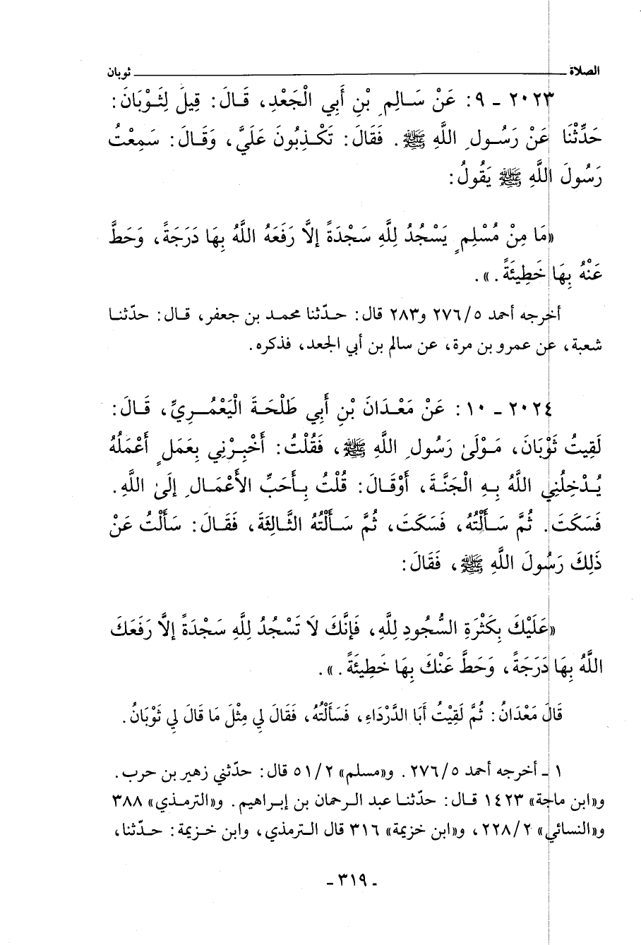 - وفي رواية: عَنْ مَعْدَانَ بْنِ طَلْحَةَ الْيَعْمَرِيِّ، قَالَ: لَقِيتُ ثَوْبَانَ، مَوْلَى رَسُولِ اللهِ صلى الله عليه وسلم، فَقُلْتُ لَهُ: دُلَّنِي عَلَى عَمَلٍ يَنْفَعُنِي اللهُ بِهِ، وَيُدْخِلُنِى اللهُ الْجَنَّةَ؟ فَسَكَتَ عَنِّي مَلِيًّا، ثُمَّ الْتَفَتَ إِلَيَّ، فَقَالَ: عَلَيْكَ بِالسُّجُودِ، فَإِنِّي سَمِعْتُ رَسُولَ اللهِ صلى الله عليه وسلم يَقُولُ: