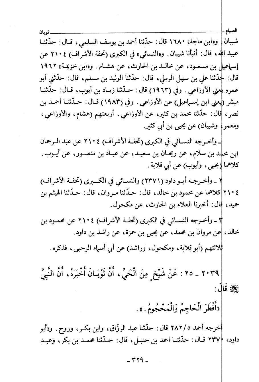 ٢٠٣٩ - عَنْ شَيْخٍ مِنْ الْحَيِّ أَخْبَرَهُ، أَنَّ ثَوْبَانَ مَوْلَى النَّبِيِّ صلى الله عليه وسلم أَخْبَرَهُ، أَنَّ النَّبِيَّ صلى الله عليه وسلم قَالَ: