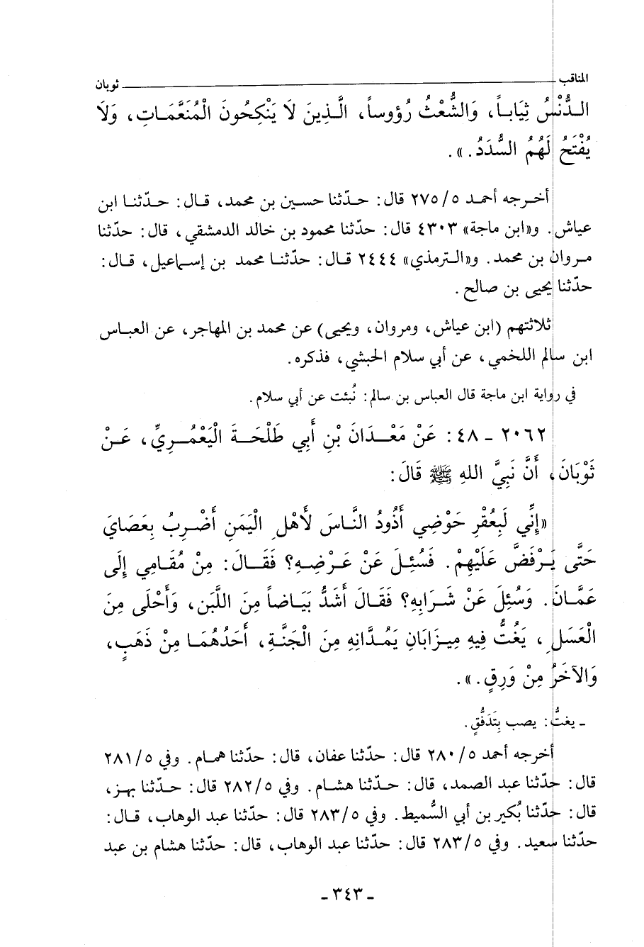 - وفي رواية: عَنِ الْعَبَّاسِ بْنِ سَالِمٍ اللَّخْمِيِّ، قَالَ: بَعَثَ عُمَرُ بْنُ عَبْدِ الْعَزِيزِ إِلَى أَبِي سَلَاّمٍ الْحَبَشِيِّ، فَحُمِلَ إِلَيْهِ عَلَى الْبَرِيدِ، لِيَسْأَلَهُ عَنِ الْحَوْضِ، فَقُدِمَ بِهِ عَلَيْهِ، فَسَأَلَهُ، فَقَالَ: سَمِعْتُ ثَوْبَانَ يَقُولُ: سَمِعْتُ رَسُولَ اللهِ صلى الله عليه وسلم يَقُولُ: