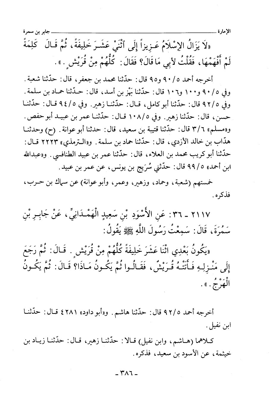 يَكُونُ بَعْدِي اثْنَا عَشَرَ خَلِيفَةً، كُلُّهُمْ مِنْ قُرَيْشٍ. قَالَ: ثُمَّ رَجَعَ إِلَى مَنْزِلِهِ، فَأَتَتْهُ قُرَيْشٌ، فَقَالُوا: ثُمَّ يَكُونُ مَاذَا؟ قَالَ: ثُمَّ يَكُونُ الْهَرْجُ.