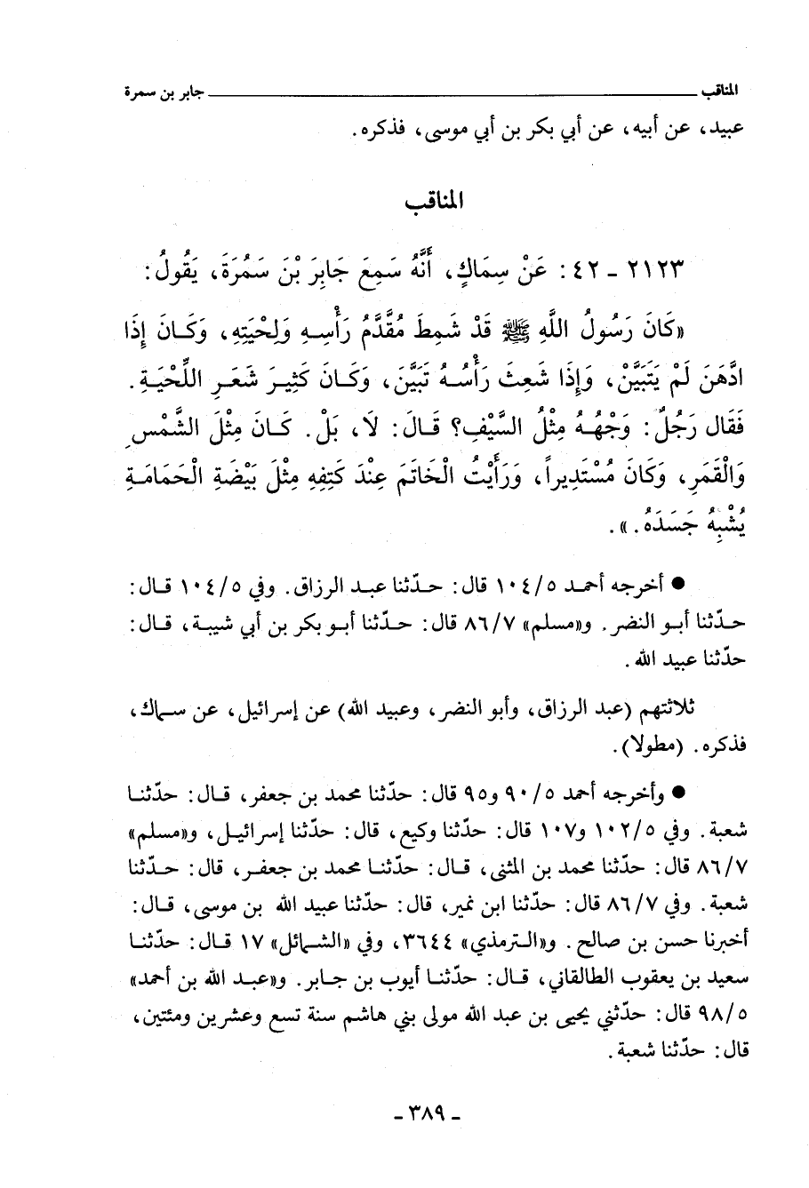 أخرجه أحمد ٥/ ٩٠ (٢١١٢٤) و ٥/ ٩٥ (٢١٢٠١) قال: حدَّثنا مُحَمد بن جَعْفَر، حدَّثنا شُعْبة. و"مسلم" ٧/ ٨٦ (٦١٥٥) قال: حدَّثنا مُحَمد بن المُثَنَّى، حدَّثنا مُحَمد بن جَعْفَر، حدَّثنا شُعْبة. وفي (٦١٥٦) قال: وحدَّثنا ابن نُمَيْر، حدَّثنا عُبَيْد اللهِ بن مُوسَى، أخبرنا حَسَن بن صالح. والتِّرْمِذِيّ" ٣٦٤٤، وفي (الشَّمائل) ١٧ قال: حدَّثنا سَعِيد بن يَعْقُوب الطَّالقَانِي، حدَّثنا أَيُّوب بن جابر. و"عَبْد الله بن أحمد" ٥/ ٩٨ (٢١٢٤١) قال: حدَّثني يَحيى بن عَبْد اللهِ، مَوْلَى بني هاشم، سَنَةَ تسعٍ وعشرين ومئتين، حدَّثنا شُعْبة.