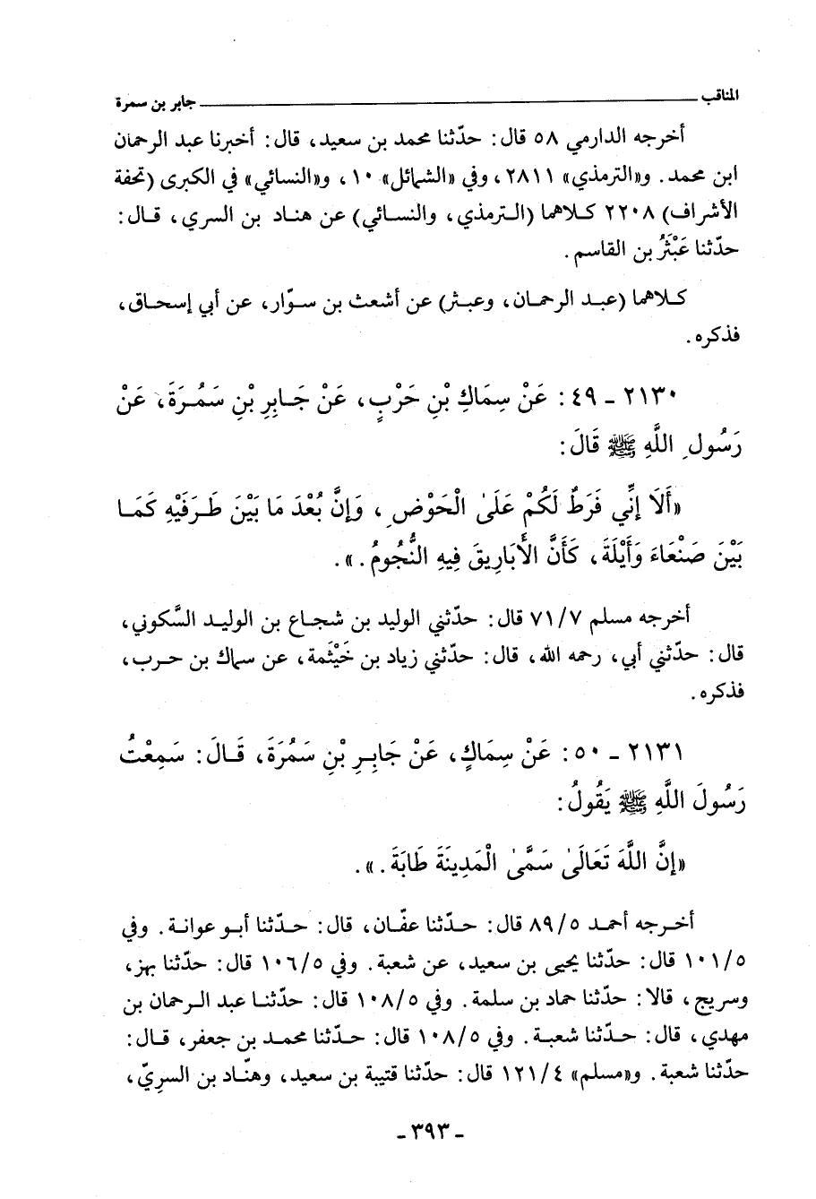 ٢١٣٠ - عَنْ سِمَاكِ بْنِ حَرْبٍ، عَنْ جَابِرِ بْنِ سَمُرَةَ، عَنْ رَسُولِ اللهِ صلى الله عليه وسلم، قَالَ: