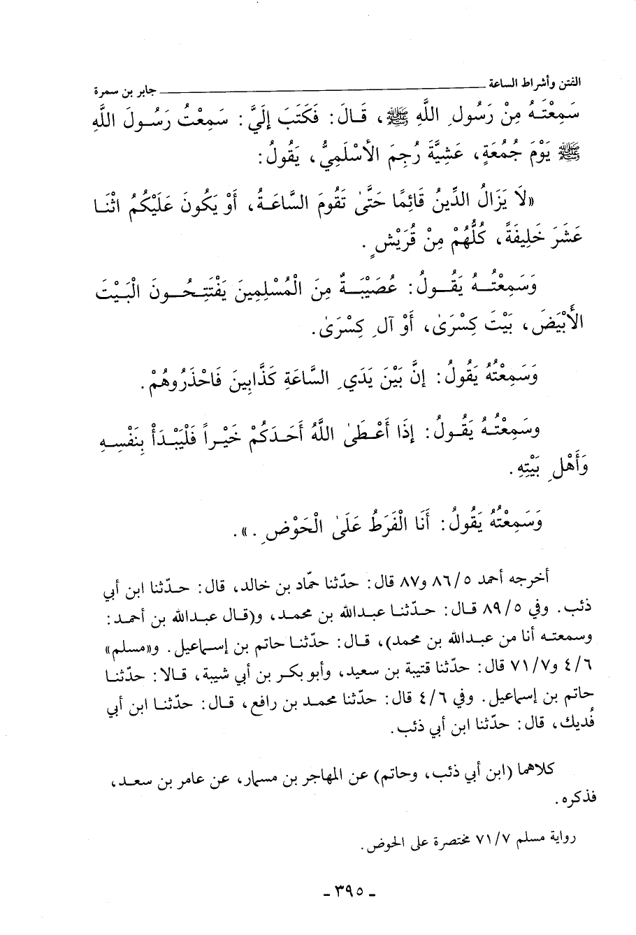 - رواية مُسْلم ٧/ ٧١ (٦٠٦٩) , مختصرة على الحَوْض: عَنْ عَامِرِ بْنِ سَعْدٍ، قَالَ: كَتَبْت إِلَى جَابِرِ بْنِ سَمُرَةَ: أَخْبِرْنِي بِشَيْءٍ سَمِعْتَهُ مِنْ رَسُولِ اللهِ صلى الله عليه وسلم، قَالَ: فَكَتَبَ: إِنِّي سَمِعْته يَقُولُ: أَنَا الْفَرَطُ عَلَى الْحَوْضِ.