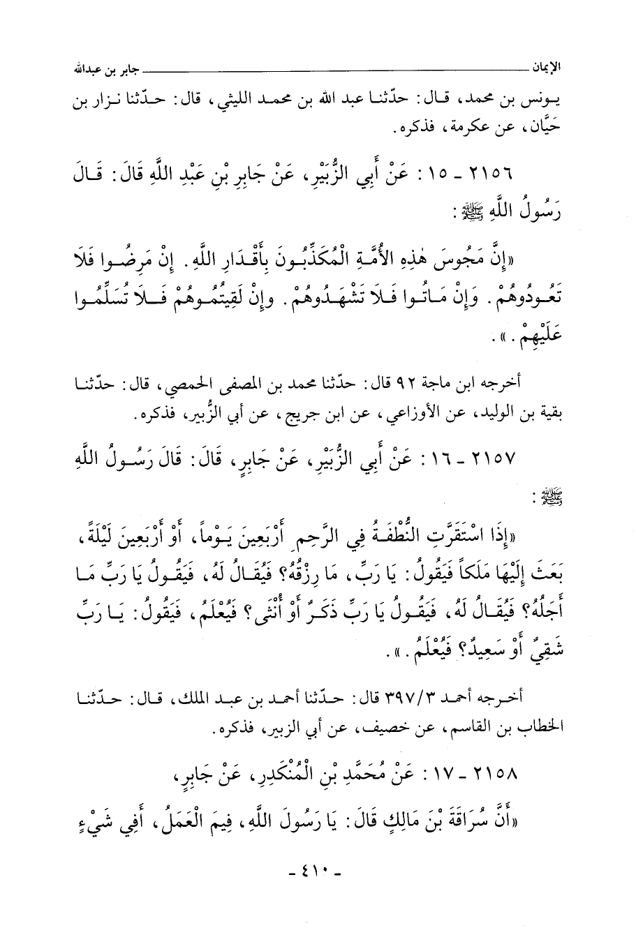 ٢١٥٦ - عَنْ أَبِي الزُّبَيْرِ، عَنْ جَابِرِ بْنِ عَبْدِ اللهِ، قَالَ: قَالَ رَسُولُ اللهِ صلى الله عليه وسلم: