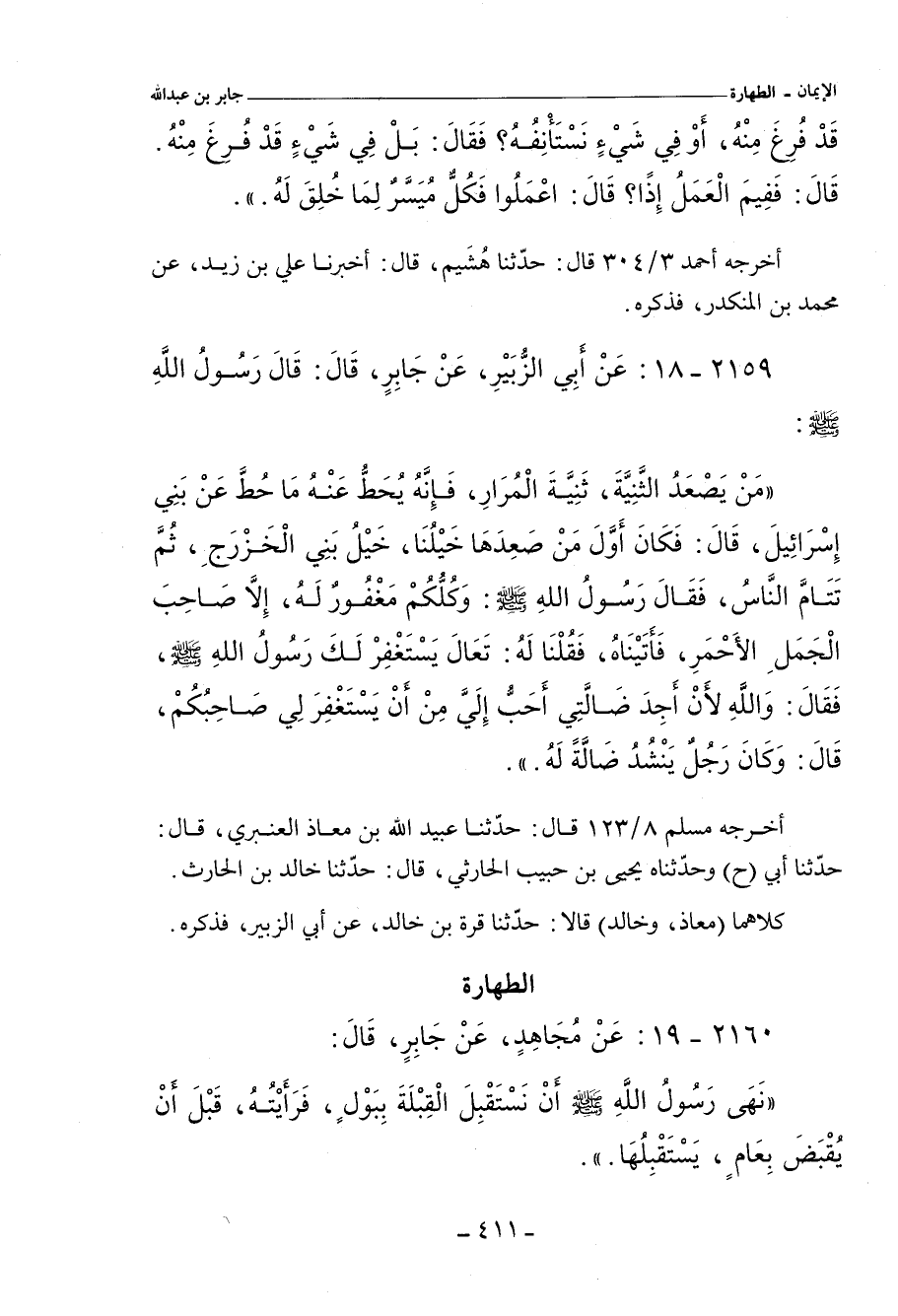 ٢١٦٠ - عَنْ مُجَاهِدِ بْنِ جَبْرٍ، عَنْ جَابِرٍ بْنِ عَبْدِ اللهِ الأَنْصَارِيِّ، قَالَ: