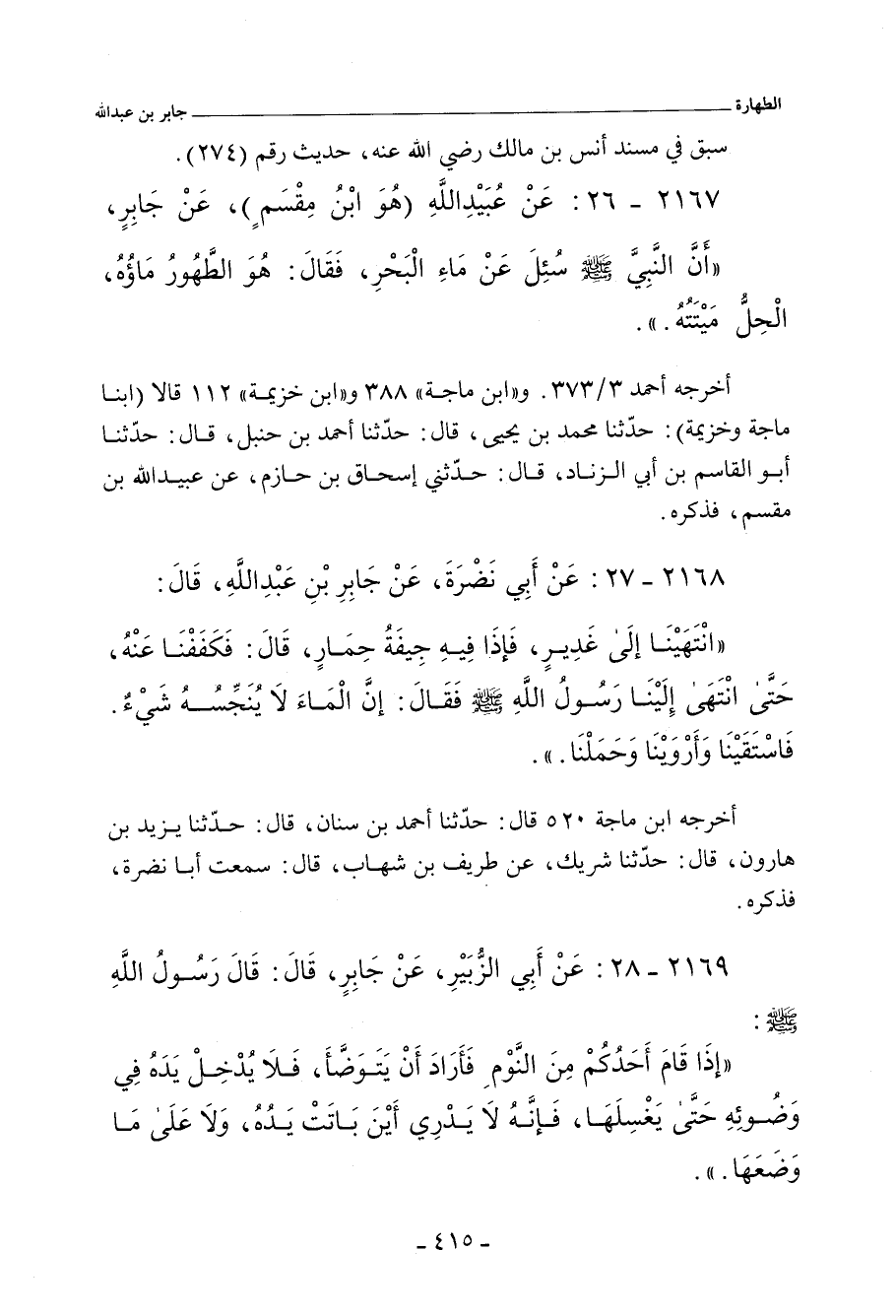 - قال أبو الحَسَن بن سَلَمَة، راوي السُّنن عن ابن ماجة: حدَّثنا علي بن الحَسَن الهَسْتَجَانِي، حدَّثنا أحمد بن حَنْبَل، حدَّثنا أبو القاسم بن أَبي الزِّنَاد، حدَّثني إِسْحَاق بن حازم، عن عُبَيْد اللهِ، هو ابن مِقْسَم، عن جابر بن عَبْد اللهِ؛ أن النَّبِيَّ صلى الله عليه وسلم .. فذكر نَحْوَهُ.