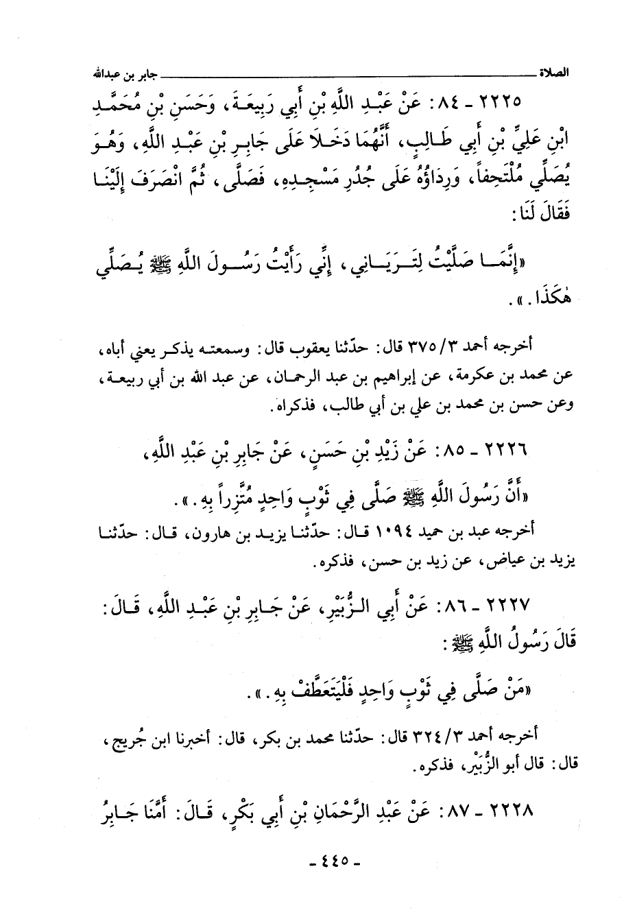 ٢٢٢٥ - عَنْ عَبْدِ اللهِ بْنِ أَبِي رَبِيعَةَ، وَعَنْ حَسَنِ بْنِ مُحَمَّدِ بْنِ عَلِيِّ بْنِ أَبِي طَالِبٍ، أَنَّهُمَا دَخَلَا عَلَى جَابِرِ بْنِ عَبْدِ اللهِ السَّلَمِيِّ، وَهُوَ يُصَلِّي مُلْتَحِفًا، وَرِدَاؤُهُ عَلَى جَدْرِ مَسْجِدِهِ، فَصَلَّى، ثُمَّ انْصَرَفَ إِلَيْنَا، فَقَالَ لَنَا: